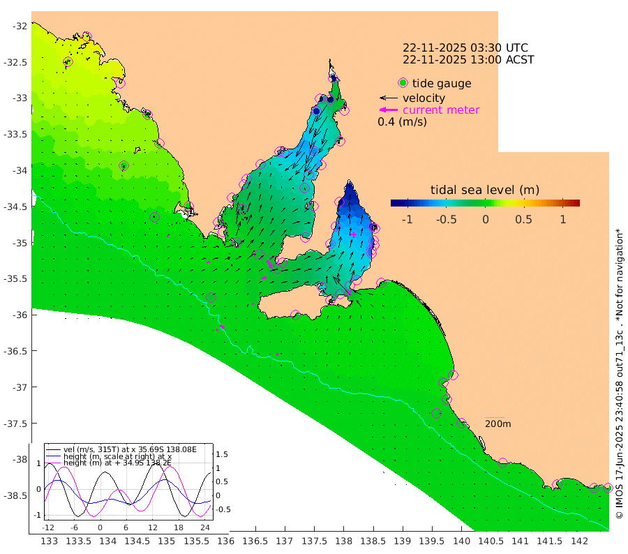 1cm/s -43T +10cm/s rms + 5cm/s 114T. SAM1DS 520m 7cm/s 82T +13cm/s rms + 5cm/s -36T. SAM2CP 100m 10cm/s 126T +21cm/s rms + 18cm/s 142T. SAM3MS 168m 7cm/s 171T +22cm/s rms + 0cm/s -30T. SAM4CY 117m 2cm/s 32T +23cm/s rms + 2cm/s 99T. SAM5CB 94m 11cm/s 78T +8cm/s rms + 3cm/s -172T. SAM6IS 83m 5cm/s 132T +11cm/s rms + 7cm/s 150T. SAM7DS 519m 20cm/s 147T +10cm/s rms + 2cm/s 87T. SAM8SG 47m 5cm/s 158T +20cm/s rms + 12cm/s -168T. NRSKAI 101m -8cm Warrnambool -8cm Port Fairy -7cm Portland -7cm Port Macdonnell -7cm Beachport -6cm Cape Rabelais (off) -3cm Robe -2cm Cape Jaffa -2cm Kingston -10cm Victor Harbor -6cm Vivonne Bay -49cm Kingscote -46cm American River -36cm Penneshaw -45cm Cape Jervis -63cm Second Valley -74cm Port Noarlunga -76cm Port Stanvac -76cm Brighton -77cm Glenelg -88cm Port Adelaide (Outer Harbor) -104cm Angus Inlet (Garden Island) -103cm Ardrossan -74cm Port Vincent -65cm Port Giles -10cm Stenhouse Bay -14cm Althorpe Island -8cm Pondalowie Bay -24cm Point Turton -22cm Port Victoria -32cm Cape Elizabeth -43cm Tiparra Reef Light -59cm Wallaroo -71cm Middle Bank -10cm Port Broughton -102cm Port Pirie -119cm Red Cliff Point (Beacon 5) -113cm Port Bonython -111cm Whyalla -101cm Western Shoal Beacon -55cm Franklin Harbor -50cm Franklin Harbor Entrance Beacon -37cm Arno Bay -31cm Port Neill -28cm Cape Hardy -21cm Tumby Bay -21cm Reevesby Island -10cm Port Lincoln -6cm Taylors Landing -17cm Whalers Bay -11cm Wedge Island Mooring -8cm Shelf Edge Mooring 2cm Coffin Bay Entrance Beacon 0cm Greenly Island 7cm Elliston 5cm Pearson Island 5cm Venus Bay 23cm Blanche Port (Streaky Bay) 23cm Thevenard 16cm St Francis Island