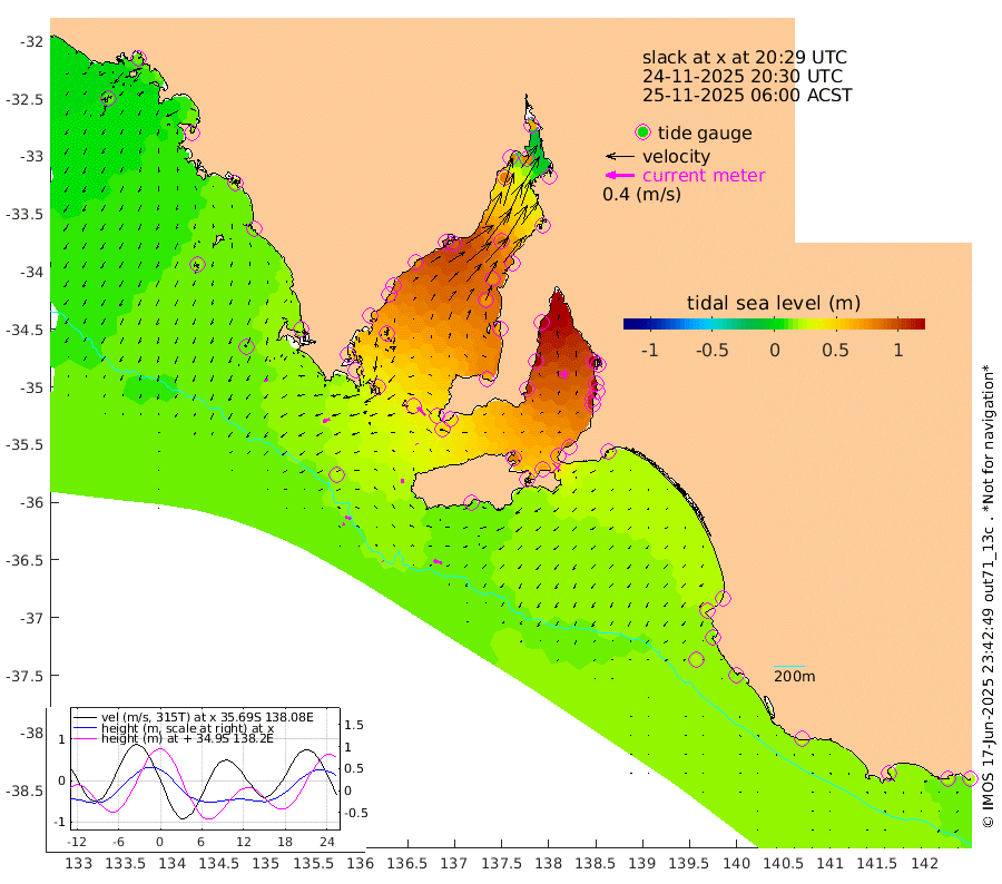 1cm/s -74T +10cm/s rms + 5cm/s 114T. SAM1DS 520m 10cm/s -113T +13cm/s rms + 5cm/s -36T. SAM2CP 100m 8cm/s -69T +21cm/s rms + 18cm/s 142T. SAM3MS 168m 12cm/s -74T +22cm/s rms + 0cm/s -30T. SAM4CY 117m 5cm/s -145T +23cm/s rms + 2cm/s 99T. SAM5CB 94m 1cm/s -37T +8cm/s rms + 3cm/s -172T. SAM6IS 83m 3cm/s -64T +11cm/s rms + 7cm/s 150T. SAM7DS 519m 15cm/s -42T +10cm/s rms + 2cm/s 87T. SAM8SG 47m 6cm/s -9T +20cm/s rms + 12cm/s -168T. NRSKAI 101m 19cm Warrnambool 20cm Port Fairy 19cm Portland 25cm Port Macdonnell 18cm Beachport 20cm Cape Rabelais (off) 18cm Robe 24cm Cape Jaffa 23cm Kingston 27cm Victor Harbor 12cm Vivonne Bay 79cm Kingscote 72cm American River 67cm Penneshaw 67cm Cape Jervis 88cm Second Valley 105cm Port Noarlunga 107cm Port Stanvac 109cm Brighton 113cm Glenelg 120cm Port Adelaide (Outer Harbor) 111cm Angus Inlet (Garden Island) 141cm Ardrossan 130cm Port Vincent 108cm Port Giles 42cm Stenhouse Bay 46cm Althorpe Island 36cm Pondalowie Bay 66cm Point Turton 66cm Port Victoria 74cm Cape Elizabeth 76cm Tiparra Reef Light 79cm Wallaroo 86cm Middle Bank 34cm Port Broughton 61cm Port Pirie 67cm Red Cliff Point (Beacon 5) 75cm Port Bonython 81cm Whyalla 80cm Western Shoal Beacon 87cm Franklin Harbor 90cm Franklin Harbor Entrance Beacon 79cm Arno Bay 85cm Port Neill 72cm Cape Hardy 65cm Tumby Bay 58cm Reevesby Island 49cm Port Lincoln 35cm Taylors Landing 56cm Whalers Bay 40cm Wedge Island Mooring 20cm Shelf Edge Mooring 22cm Coffin Bay Entrance Beacon 14cm Greenly Island 18cm Elliston 15cm Pearson Island 23cm Venus Bay 21cm Blanche Port (Streaky Bay) 14cm Thevenard 13cm St Francis Island