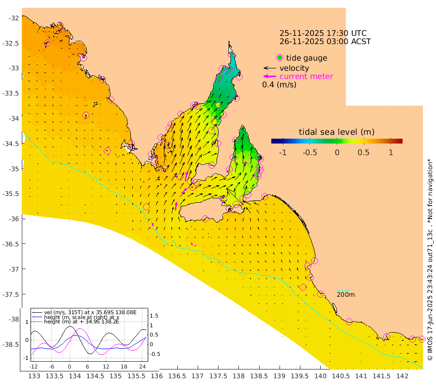 1cm/s -27T +10cm/s rms + 5cm/s 114T. SAM1DS 520m 5cm/s 14T +13cm/s rms + 5cm/s -36T. SAM2CP 100m 8cm/s -1T +21cm/s rms + 18cm/s 142T. SAM3MS 168m 8cm/s -25T +22cm/s rms + 0cm/s -30T. SAM4CY 117m 3cm/s -46T +23cm/s rms + 2cm/s 99T. SAM5CB 94m 23cm/s 46T +8cm/s rms + 3cm/s -172T. SAM6IS 83m 4cm/s 0T +11cm/s rms + 7cm/s 150T. SAM7DS 519m 30cm/s 13T +10cm/s rms + 2cm/s 87T. SAM8SG 47m 25cm/s 10T +20cm/s rms + 12cm/s -168T. NRSKAI 101m 45cm Warrnambool 42cm Port Fairy 44cm Portland 42cm Port Macdonnell 42cm Beachport 45cm Cape Rabelais (off) 44cm Robe 47cm Cape Jaffa 46cm Kingston 48cm Victor Harbor 44cm Vivonne Bay 28cm Kingscote 21cm American River 36cm Penneshaw 23cm Cape Jervis 16cm Second Valley 11cm Port Noarlunga 10cm Port Stanvac 9cm Brighton 11cm Glenelg 3cm Port Adelaide (Outer Harbor) -16cm Angus Inlet (Garden Island) 1cm Ardrossan 11cm Port Vincent 22cm Port Giles 44cm Stenhouse Bay 47cm Althorpe Island 39cm Pondalowie Bay 43cm Point Turton 39cm Port Victoria 36cm Cape Elizabeth 37cm Tiparra Reef Light 22cm Wallaroo 21cm Middle Bank -12cm Port Broughton -26cm Port Pirie -33cm Red Cliff Point (Beacon 5) -21cm Port Bonython -15cm Whyalla -7cm Western Shoal Beacon 19cm Franklin Harbor 50cm Franklin Harbor Entrance Beacon 55cm Arno Bay 67cm Port Neill 62cm Cape Hardy 65cm Tumby Bay 56cm Reevesby Island 62cm Port Lincoln 57cm Taylors Landing 46cm Whalers Bay 49cm Wedge Island Mooring 45cm Shelf Edge Mooring 53cm Coffin Bay Entrance Beacon 46cm Greenly Island 55cm Elliston 49cm Pearson Island 42cm Venus Bay 68cm Blanche Port (Streaky Bay) 66cm Thevenard 57cm St Francis Island