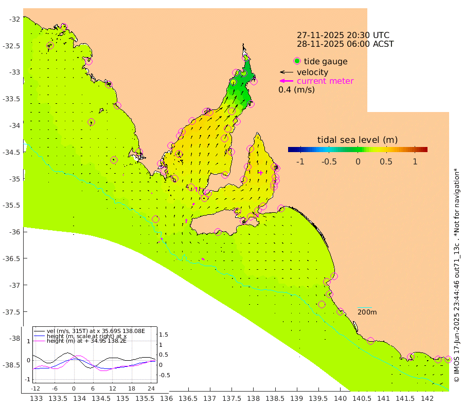 1cm/s -56T +10cm/s rms + 5cm/s 114T. SAM1DS 520m 2cm/s -84T +13cm/s rms + 5cm/s -36T. SAM2CP 100m 5cm/s -44T +21cm/s rms + 18cm/s 142T. SAM3MS 168m 8cm/s -59T +22cm/s rms + 0cm/s -30T. SAM4CY 117m 1cm/s -104T +23cm/s rms + 2cm/s 99T. SAM5CB 94m 7cm/s 39T +8cm/s rms + 3cm/s -172T. SAM6IS 83m 2cm/s -39T +11cm/s rms + 7cm/s 150T. SAM7DS 519m 14cm/s -4T +10cm/s rms + 2cm/s 87T. SAM8SG 47m 11cm/s 6T +20cm/s rms + 12cm/s -168T. NRSKAI 101m 21cm Warrnambool 21cm Port Fairy 21cm Portland 26cm Port Macdonnell 21cm Beachport 23cm Cape Rabelais (off) 21cm Robe 27cm Cape Jaffa 25cm Kingston 26cm Victor Harbor 20cm Vivonne Bay 34cm Kingscote 31cm American River 35cm Penneshaw 30cm Cape Jervis 38cm Second Valley 37cm Port Noarlunga 38cm Port Stanvac 39cm Brighton 41cm Glenelg 39cm Port Adelaide (Outer Harbor) 30cm Angus Inlet (Garden Island) 44cm Ardrossan 42cm Port Vincent 42cm Port Giles 30cm Stenhouse Bay 33cm Althorpe Island 26cm Pondalowie Bay 35cm Point Turton 34cm Port Victoria 36cm Cape Elizabeth 35cm Tiparra Reef Light 33cm Wallaroo 35cm Middle Bank 15cm Port Broughton 16cm Port Pirie 19cm Red Cliff Point (Beacon 5) 17cm Port Bonython 24cm Whyalla 27cm Western Shoal Beacon 35cm Franklin Harbor 46cm Franklin Harbor Entrance Beacon 43cm Arno Bay 49cm Port Neill 44cm Cape Hardy 44cm Tumby Bay 33cm Reevesby Island 36cm Port Lincoln 30cm Taylors Landing 34cm Whalers Bay 30cm Wedge Island Mooring 23cm Shelf Edge Mooring 26cm Coffin Bay Entrance Beacon 21cm Greenly Island 28cm Elliston 23cm Pearson Island 22cm Venus Bay 30cm Blanche Port (Streaky Bay) 27cm Thevenard 23cm St Francis Island