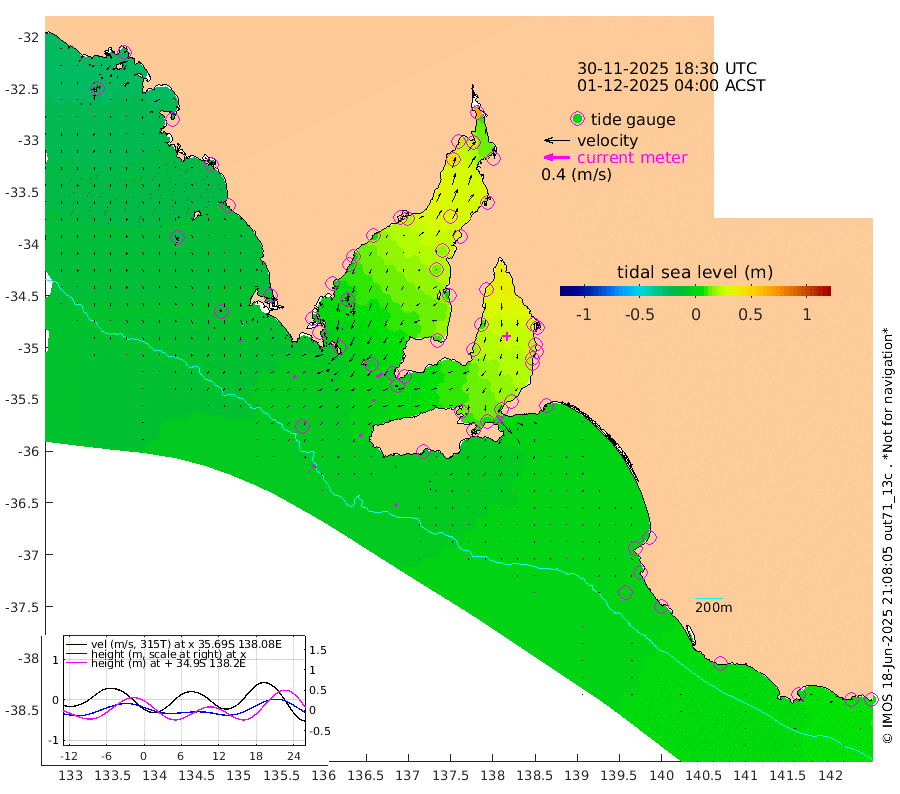 0cm/s -97T +10cm/s rms + 5cm/s 114T. SAM1DS 520m 5cm/s -121T +13cm/s rms + 5cm/s -36T. SAM2CP 100m 4cm/s -89T +21cm/s rms + 18cm/s 142T. SAM3MS 168m 3cm/s -58T +22cm/s rms + 0cm/s -30T. SAM4CY 117m 3cm/s 173T +23cm/s rms + 2cm/s 99T. SAM5CB 94m 3cm/s -139T +8cm/s rms + 3cm/s -172T. SAM6IS 83m 2cm/s -92T +11cm/s rms + 7cm/s 150T. SAM7DS 519m 9cm/s -127T +10cm/s rms + 2cm/s 87T. SAM8SG 47m 6cm/s -154T +20cm/s rms + 12cm/s -168T. NRSKAI 101m 6cm Warrnambool 4cm Port Fairy 2cm Portland 0cm Port Macdonnell -3cm Beachport -3cm Cape Rabelais (off) -3cm Robe -1cm Cape Jaffa 0cm Kingston -2cm Victor Harbor -8cm Vivonne Bay 12cm Kingscote 9cm American River 6cm Penneshaw 10cm Cape Jervis 19cm Second Valley 20cm Port Noarlunga 20cm Port Stanvac 20cm Brighton 20cm Glenelg 24cm Port Adelaide (Outer Harbor) 29cm Angus Inlet (Garden Island) 27cm Ardrossan 11cm Port Vincent 16cm Port Giles -4cm Stenhouse Bay 0cm Althorpe Island -4cm Pondalowie Bay 9cm Point Turton 5cm Port Victoria 12cm Cape Elizabeth 18cm Tiparra Reef Light 28cm Wallaroo 31cm Middle Bank 18cm Port Broughton 52cm Port Pirie 65cm Red Cliff Point (Beacon 5) 44cm Port Bonython 52cm Whyalla 51cm Western Shoal Beacon 33cm Franklin Harbor 20cm Franklin Harbor Entrance Beacon 7cm Arno Bay 6cm Port Neill 4cm Cape Hardy 0cm Tumby Bay -2cm Reevesby Island -6cm Port Lincoln -9cm Taylors Landing 1cm Whalers Bay -4cm Wedge Island Mooring -8cm Shelf Edge Mooring -11cm Coffin Bay Entrance Beacon -12cm Greenly Island -14cm Elliston -21cm Pearson Island -8cm Venus Bay -23cm Blanche Port (Streaky Bay) -24cm Thevenard -22cm St Francis Island