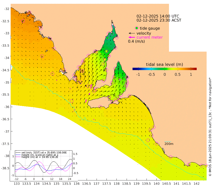 0cm/s 176T +10cm/s rms + 5cm/s 114T. SAM1DS 520m 5cm/s 12T +13cm/s rms + 5cm/s -36T. SAM2CP 100m 6cm/s 14T +21cm/s rms + 18cm/s 142T. SAM3MS 168m 4cm/s -30T +22cm/s rms + 0cm/s -30T. SAM4CY 117m 4cm/s -45T +23cm/s rms + 2cm/s 99T. SAM5CB 94m 13cm/s 42T +8cm/s rms + 3cm/s -172T. SAM6IS 83m 3cm/s 12T +11cm/s rms + 7cm/s 150T. SAM7DS 519m 26cm/s 13T +10cm/s rms + 2cm/s 87T. SAM8SG 47m 21cm/s 12T +20cm/s rms + 12cm/s -168T. NRSKAI 101m 34cm Warrnambool 32cm Port Fairy 35cm Portland 36cm Port Macdonnell 38cm Beachport 39cm Cape Rabelais (off) 39cm Robe 40cm Cape Jaffa 39cm Kingston 44cm Victor Harbor 42cm Vivonne Bay 30cm Kingscote 28cm American River 35cm Penneshaw 26cm Cape Jervis 18cm Second Valley 18cm Port Noarlunga 18cm Port Stanvac 16cm Brighton 16cm Glenelg 12cm Port Adelaide (Outer Harbor) -5cm Angus Inlet (Garden Island) 11cm Ardrossan 32cm Port Vincent 27cm Port Giles 43cm Stenhouse Bay 44cm Althorpe Island 40cm Pondalowie Bay 42cm Point Turton 38cm Port Victoria 36cm Cape Elizabeth 37cm Tiparra Reef Light 22cm Wallaroo 20cm Middle Bank -8cm Port Broughton -21cm Port Pirie -35cm Red Cliff Point (Beacon 5) -13cm Port Bonython -12cm Whyalla -3cm Western Shoal Beacon 18cm Franklin Harbor 44cm Franklin Harbor Entrance Beacon 52cm Arno Bay 59cm Port Neill 57cm Cape Hardy 59cm Tumby Bay 60cm Reevesby Island 60cm Port Lincoln 56cm Taylors Landing 45cm Whalers Bay 48cm Wedge Island Mooring 44cm Shelf Edge Mooring 55cm Coffin Bay Entrance Beacon 46cm Greenly Island 55cm Elliston 53cm Pearson Island 46cm Venus Bay 75cm Blanche Port (Streaky Bay) 74cm Thevenard 64cm St Francis Island