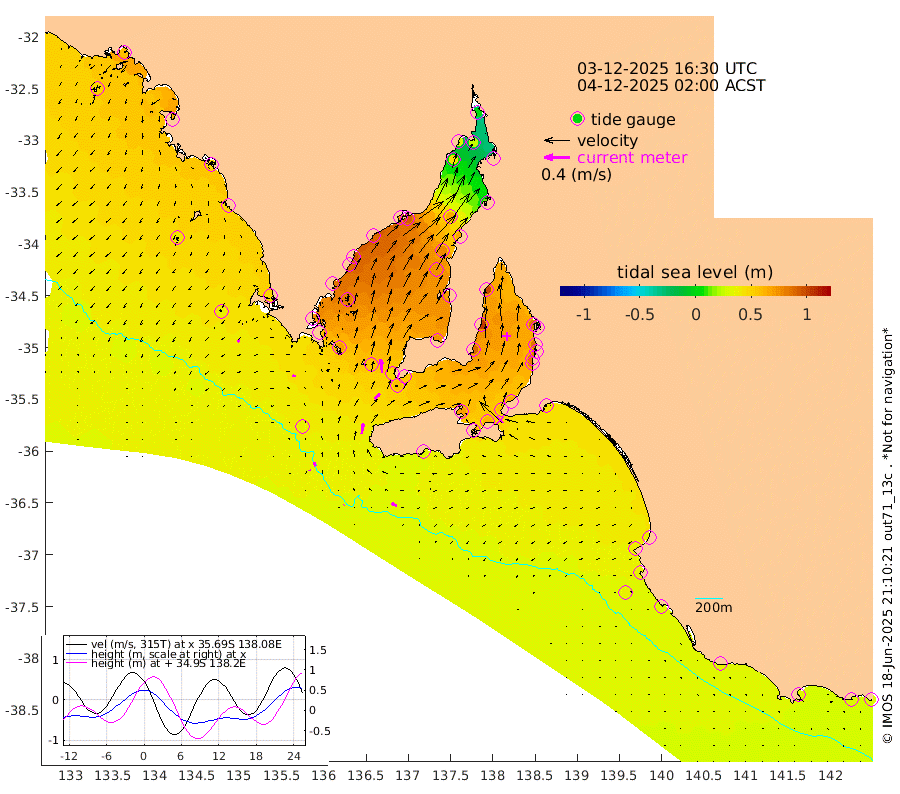 1cm/s -102T +10cm/s rms + 5cm/s 114T. SAM1DS 520m 5cm/s -83T +13cm/s rms + 5cm/s -36T. SAM2CP 100m 6cm/s -26T +21cm/s rms + 18cm/s 142T. SAM3MS 168m 9cm/s -67T +22cm/s rms + 0cm/s -30T. SAM4CY 117m 4cm/s -120T +23cm/s rms + 2cm/s 99T. SAM5CB 94m 11cm/s 43T +8cm/s rms + 3cm/s -172T. SAM6IS 83m 2cm/s -12T +11cm/s rms + 7cm/s 150T. SAM7DS 519m 22cm/s -6T +10cm/s rms + 2cm/s 87T. SAM8SG 47m 16cm/s 8T +20cm/s rms + 12cm/s -168T. NRSKAI 101m 33cm Warrnambool 31cm Port Fairy 33cm Portland 35cm Port Macdonnell 32cm Beachport 34cm Cape Rabelais (off) 35cm Robe 39cm Cape Jaffa 37cm Kingston 43cm Victor Harbor 30cm Vivonne Bay 71cm Kingscote 61cm American River 63cm Penneshaw 58cm Cape Jervis 65cm Second Valley 78cm Port Noarlunga 80cm Port Stanvac 80cm Brighton 83cm Glenelg 84cm Port Adelaide (Outer Harbor) 63cm Angus Inlet (Garden Island) 98cm Ardrossan 101cm Port Vincent 88cm Port Giles 54cm Stenhouse Bay 58cm Althorpe Island 48cm Pondalowie Bay 74cm Point Turton 70cm Port Victoria 72cm Cape Elizabeth 75cm Tiparra Reef Light 65cm Wallaroo 67cm Middle Bank 12cm Port Broughton 11cm Port Pirie 3cm Red Cliff Point (Beacon 5) 23cm Port Bonython 33cm Whyalla 43cm Western Shoal Beacon 70cm Franklin Harbor 90cm Franklin Harbor Entrance Beacon 88cm Arno Bay 96cm Port Neill 87cm Cape Hardy 83cm Tumby Bay 80cm Reevesby Island 73cm Port Lincoln 58cm Taylors Landing 68cm Whalers Bay 56cm Wedge Island Mooring 36cm Shelf Edge Mooring 49cm Coffin Bay Entrance Beacon 36cm Greenly Island 46cm Elliston 38cm Pearson Island 45cm Venus Bay 64cm Blanche Port (Streaky Bay) 59cm Thevenard 47cm St Francis Island