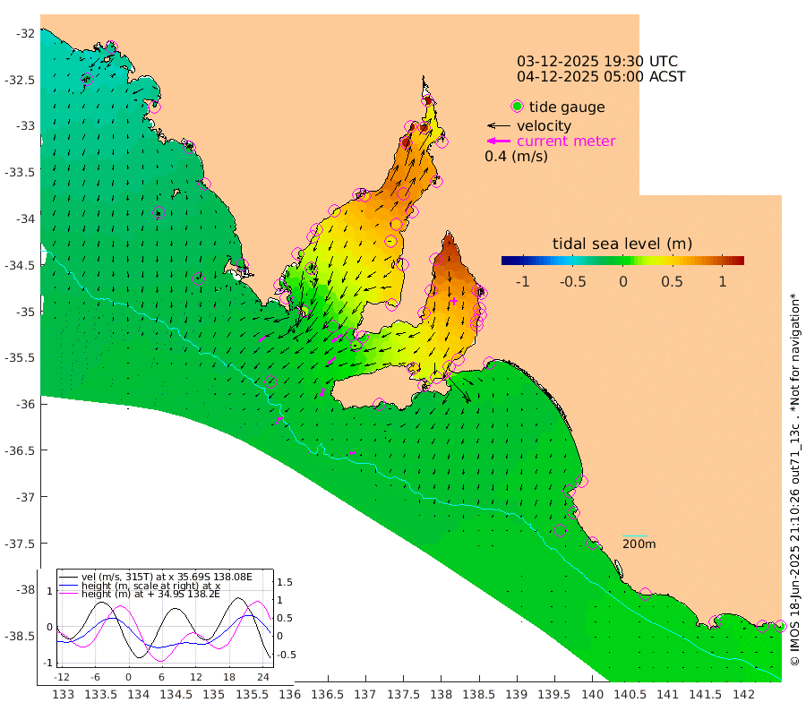 1cm/s -125T +10cm/s rms + 5cm/s 114T. SAM1DS 520m 13cm/s -125T +13cm/s rms + 5cm/s -36T. SAM2CP 100m 9cm/s -112T +21cm/s rms + 18cm/s 142T. SAM3MS 168m 10cm/s -92T +22cm/s rms + 0cm/s -30T. SAM4CY 117m 6cm/s -171T +23cm/s rms + 2cm/s 99T. SAM5CB 94m 16cm/s -129T +8cm/s rms + 3cm/s -172T. SAM6IS 83m 3cm/s -120T +11cm/s rms + 7cm/s 150T. SAM7DS 519m 21cm/s -126T +10cm/s rms + 2cm/s 87T. SAM8SG 47m 14cm/s -160T +20cm/s rms + 12cm/s -168T. NRSKAI 101m 5cm Warrnambool 3cm Port Fairy 1cm Portland 3cm Port Macdonnell -5cm Beachport -4cm Cape Rabelais (off) -4cm Robe -1cm Cape Jaffa -1cm Kingston -2cm Victor Harbor -14cm Vivonne Bay 46cm Kingscote 44cm American River 30cm Penneshaw 40cm Cape Jervis 61cm Second Valley 73cm Port Noarlunga 75cm Port Stanvac 76cm Brighton 78cm Glenelg 87cm Port Adelaide (Outer Harbor) 99cm Angus Inlet (Garden Island) 101cm Ardrossan 73cm Port Vincent 66cm Port Giles 7cm Stenhouse Bay 14cm Althorpe Island 6cm Pondalowie Bay 34cm Point Turton 32cm Port Victoria 41cm Cape Elizabeth 54cm Tiparra Reef Light 72cm Wallaroo 78cm Middle Bank 57cm Port Broughton 111cm Port Pirie 125cm Red Cliff Point (Beacon 5) 108cm Port Bonython 115cm Whyalla 110cm Western Shoal Beacon 74cm Franklin Harbor 52cm Franklin Harbor Entrance Beacon 33cm Arno Bay 31cm Port Neill 23cm Cape Hardy 14cm Tumby Bay 14cm Reevesby Island 1cm Port Lincoln -8cm Taylors Landing 21cm Whalers Bay 3cm Wedge Island Mooring -10cm Shelf Edge Mooring -14cm Coffin Bay Entrance Beacon -17cm Greenly Island -19cm Elliston -24cm Pearson Island -6cm Venus Bay -29cm Blanche Port (Streaky Bay) -33cm Thevenard -25cm St Francis Island