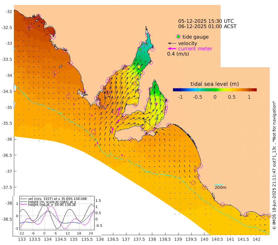 1cm/s -30T +10cm/s rms + 5cm/s 114T. SAM1DS 520m 7cm/s 12T +13cm/s rms + 5cm/s -36T. SAM2CP 100m 10cm/s -5T +21cm/s rms + 18cm/s 142T. SAM3MS 168m 10cm/s -35T +22cm/s rms + 0cm/s -30T. SAM4CY 117m 5cm/s -45T +23cm/s rms + 2cm/s 99T. SAM5CB 94m 26cm/s 45T +8cm/s rms + 3cm/s -172T. SAM6IS 83m 4cm/s -6T +11cm/s rms + 7cm/s 150T. SAM7DS 519m 40cm/s 11T +10cm/s rms + 2cm/s 87T. SAM8SG 47m 32cm/s 11T +20cm/s rms + 12cm/s -168T. NRSKAI 101m 57cm Warrnambool 55cm Port Fairy 58cm Portland 57cm Port Macdonnell 59cm Beachport 61cm Cape Rabelais (off) 61cm Robe 65cm Cape Jaffa 61cm Kingston 67cm Victor Harbor 61cm Vivonne Bay 47cm Kingscote 39cm American River 54cm Penneshaw 39cm Cape Jervis 30cm Second Valley 26cm Port Noarlunga 26cm Port Stanvac 24cm Brighton 24cm Glenelg 18cm Port Adelaide (Outer Harbor) -9cm Angus Inlet (Garden Island) 16cm Ardrossan 39cm Port Vincent 40cm Port Giles 63cm Stenhouse Bay 64cm Althorpe Island 58cm Pondalowie Bay 65cm Point Turton 60cm Port Victoria 58cm Cape Elizabeth 55cm Tiparra Reef Light 37cm Wallaroo 37cm Middle Bank -11cm Port Broughton -24cm Port Pirie -41cm Red Cliff Point (Beacon 5) -17cm Port Bonython -10cm Whyalla -1cm Western Shoal Beacon 36cm Franklin Harbor 72cm Franklin Harbor Entrance Beacon 79cm Arno Bay 89cm Port Neill 87cm Cape Hardy 90cm Tumby Bay 85cm Reevesby Island 89cm Port Lincoln 82cm Taylors Landing 67cm Whalers Bay 72cm Wedge Island Mooring 65cm Shelf Edge Mooring 78cm Coffin Bay Entrance Beacon 67cm Greenly Island 79cm Elliston 73cm Pearson Island 63cm Venus Bay 102cm Blanche Port (Streaky Bay) 99cm Thevenard 83cm St Francis Island