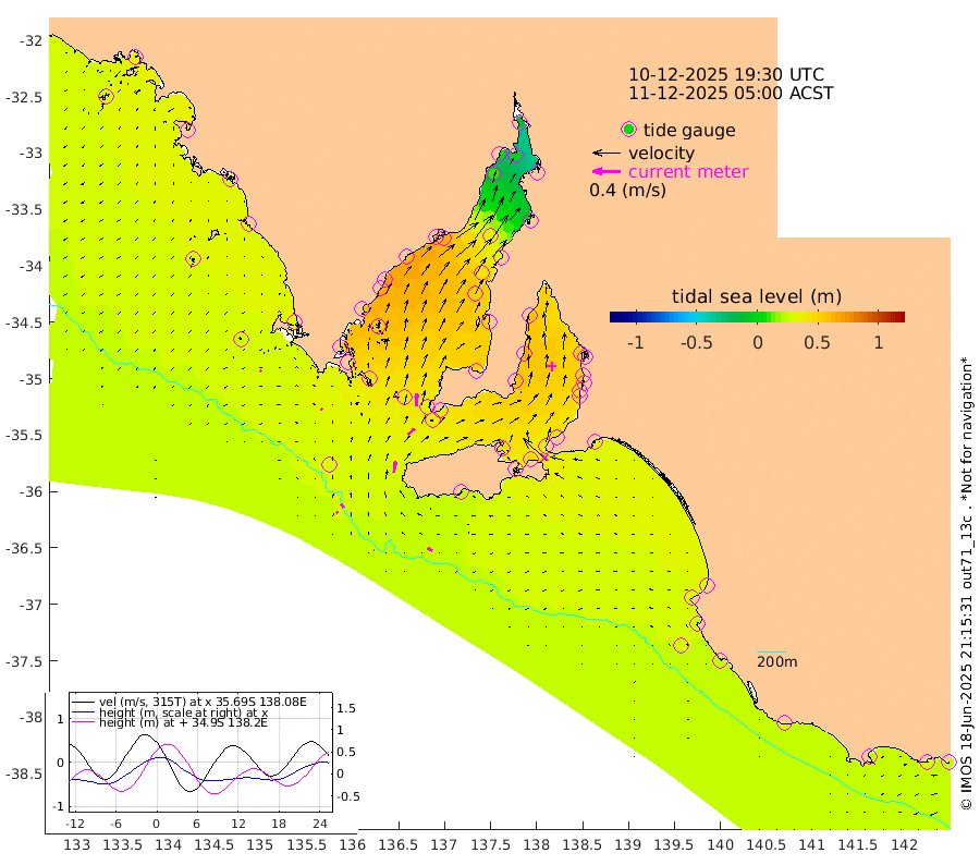 1cm/s -50T +10cm/s rms + 5cm/s 114T. SAM1DS 520m 2cm/s -61T +13cm/s rms + 5cm/s -36T. SAM2CP 100m 7cm/s -30T +21cm/s rms + 18cm/s 142T. SAM3MS 168m 8cm/s -59T +22cm/s rms + 0cm/s -30T. SAM4CY 117m 2cm/s -123T +23cm/s rms + 2cm/s 99T. SAM5CB 94m 12cm/s 47T +8cm/s rms + 3cm/s -172T. SAM6IS 83m 3cm/s -22T +11cm/s rms + 7cm/s 150T. SAM7DS 519m 19cm/s 3T +10cm/s rms + 2cm/s 87T. SAM8SG 47m 16cm/s 8T +20cm/s rms + 12cm/s -168T. NRSKAI 101m 26cm Warrnambool 26cm Port Fairy 26cm Portland 31cm Port Macdonnell 26cm Beachport 27cm Cape Rabelais (off) 26cm Robe 31cm Cape Jaffa 31cm Kingston 32cm Victor Harbor 23cm Vivonne Bay 45cm Kingscote 37cm American River 45cm Penneshaw 36cm Cape Jervis 44cm Second Valley 48cm Port Noarlunga 48cm Port Stanvac 47cm Brighton 50cm Glenelg 50cm Port Adelaide (Outer Harbor) 29cm Angus Inlet (Garden Island) 58cm Ardrossan 65cm Port Vincent 56cm Port Giles 38cm Stenhouse Bay 39cm Althorpe Island 33cm Pondalowie Bay 48cm Point Turton 45cm Port Victoria 51cm Cape Elizabeth 43cm Tiparra Reef Light 34cm Wallaroo 36cm Middle Bank 0cm Port Broughton -12cm Port Pirie -12cm Red Cliff Point (Beacon 5) -3cm Port Bonython 5cm Whyalla 9cm Western Shoal Beacon 45cm Franklin Harbor 61cm Franklin Harbor Entrance Beacon 58cm Arno Bay 68cm Port Neill 60cm Cape Hardy 59cm Tumby Bay 49cm Reevesby Island 50cm Port Lincoln 42cm Taylors Landing 43cm Whalers Bay 40cm Wedge Island Mooring 27cm Shelf Edge Mooring 34cm Coffin Bay Entrance Beacon 26cm Greenly Island 32cm Elliston 28cm Pearson Island 29cm Venus Bay 41cm Blanche Port (Streaky Bay) 36cm Thevenard 27cm St Francis Island