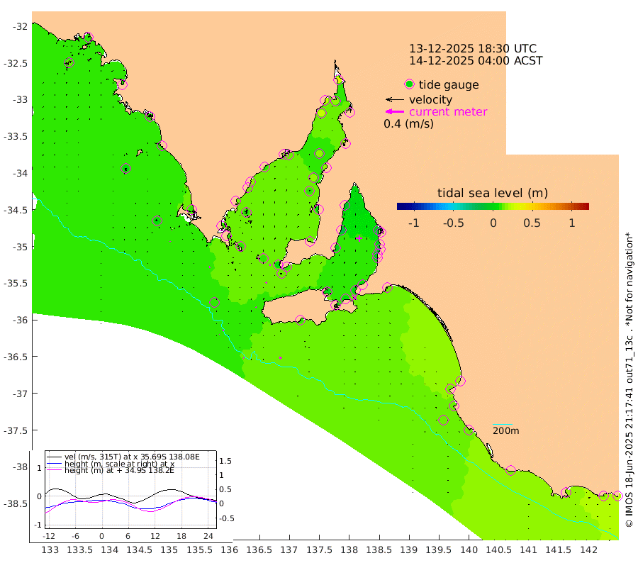 1cm/s -67T +10cm/s rms + 5cm/s 114T. SAM1DS 520m 2cm/s -124T +13cm/s rms + 5cm/s -36T. SAM2CP 100m 1cm/s -83T +21cm/s rms + 18cm/s 142T. SAM3MS 168m 5cm/s -58T +22cm/s rms + 0cm/s -30T. SAM4CY 117m 0cm/s -176T +23cm/s rms + 2cm/s 99T. SAM5CB 94m 3cm/s 78T +8cm/s rms + 3cm/s -172T. SAM6IS 83m 1cm/s -94T +11cm/s rms + 7cm/s 150T. SAM7DS 519m 2cm/s -103T +10cm/s rms + 2cm/s 87T. SAM8SG 47m 1cm/s -17T +20cm/s rms + 12cm/s -168T. NRSKAI 101m 20cm Warrnambool 17cm Port Fairy 16cm Portland 15cm Port Macdonnell 11cm Beachport 13cm Cape Rabelais (off) 13cm Robe 15cm Cape Jaffa 16cm Kingston 13cm Victor Harbor 9cm Vivonne Bay 2cm Kingscote 2cm American River 5cm Penneshaw 4cm Cape Jervis 4cm Second Valley -3cm Port Noarlunga -4cm Port Stanvac -4cm Brighton -3cm Glenelg -7cm Port Adelaide (Outer Harbor) -7cm Angus Inlet (Garden Island) -10cm Ardrossan -16cm Port Vincent -3cm Port Giles 8cm Stenhouse Bay 14cm Althorpe Island 7cm Pondalowie Bay 12cm Point Turton 7cm Port Victoria 8cm Cape Elizabeth 17cm Tiparra Reef Light 18cm Wallaroo 17cm Middle Bank 20cm Port Broughton 26cm Port Pirie 32cm Red Cliff Point (Beacon 5) 17cm Port Bonython 23cm Whyalla 26cm Western Shoal Beacon 14cm Franklin Harbor 14cm Franklin Harbor Entrance Beacon 10cm Arno Bay 16cm Port Neill 13cm Cape Hardy 13cm Tumby Bay 8cm Reevesby Island 9cm Port Lincoln 8cm Taylors Landing 10cm Whalers Bay 9cm Wedge Island Mooring 8cm Shelf Edge Mooring 10cm Coffin Bay Entrance Beacon 6cm Greenly Island 10cm Elliston 4cm Pearson Island 9cm Venus Bay 9cm Blanche Port (Streaky Bay) 8cm Thevenard 14cm St Francis Island