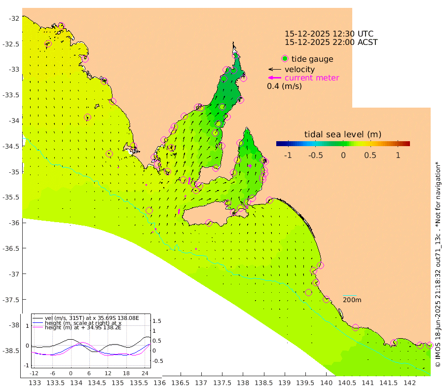 1cm/s 120T +10cm/s rms + 5cm/s 114T. SAM1DS 520m 4cm/s 5T +13cm/s rms + 5cm/s -36T. SAM2CP 100m 6cm/s 0T +21cm/s rms + 18cm/s 142T. SAM3MS 168m 4cm/s 12T +22cm/s rms + 0cm/s -30T. SAM4CY 117m 3cm/s -38T +23cm/s rms + 2cm/s 99T. SAM5CB 94m 6cm/s 26T +8cm/s rms + 3cm/s -172T. SAM6IS 83m 3cm/s -7T +11cm/s rms + 7cm/s 150T. SAM7DS 519m 22cm/s 10T +10cm/s rms + 2cm/s 87T. SAM8SG 47m 16cm/s 11T +20cm/s rms + 12cm/s -168T. NRSKAI 101m 18cm Warrnambool 19cm Port Fairy 21cm Portland 21cm Port Macdonnell 24cm Beachport 22cm Cape Rabelais (off) 23cm Robe 23cm Cape Jaffa 21cm Kingston 27cm Victor Harbor 27cm Vivonne Bay 24cm Kingscote 24cm American River 27cm Penneshaw 22cm Cape Jervis 20cm Second Valley 21cm Port Noarlunga 21cm Port Stanvac 21cm Brighton 18cm Glenelg 21cm Port Adelaide (Outer Harbor) 10cm Angus Inlet (Garden Island) 22cm Ardrossan 34cm Port Vincent 26cm Port Giles 26cm Stenhouse Bay 25cm Althorpe Island 22cm Pondalowie Bay 24cm Point Turton 22cm Port Victoria 25cm Cape Elizabeth 21cm Tiparra Reef Light 14cm Wallaroo 17cm Middle Bank -20cm Port Broughton -8cm Port Pirie -13cm Red Cliff Point (Beacon 5) -3cm Port Bonython 0cm Whyalla 4cm Western Shoal Beacon 18cm Franklin Harbor 32cm Franklin Harbor Entrance Beacon 34cm Arno Bay 33cm Port Neill 34cm Cape Hardy 35cm Tumby Bay 38cm Reevesby Island 36cm Port Lincoln 35cm Taylors Landing 26cm Whalers Bay 29cm Wedge Island Mooring 27cm Shelf Edge Mooring 31cm Coffin Bay Entrance Beacon 29cm Greenly Island 30cm Elliston 30cm Pearson Island 24cm Venus Bay 39cm Blanche Port (Streaky Bay) 38cm Thevenard 35cm St Francis Island
