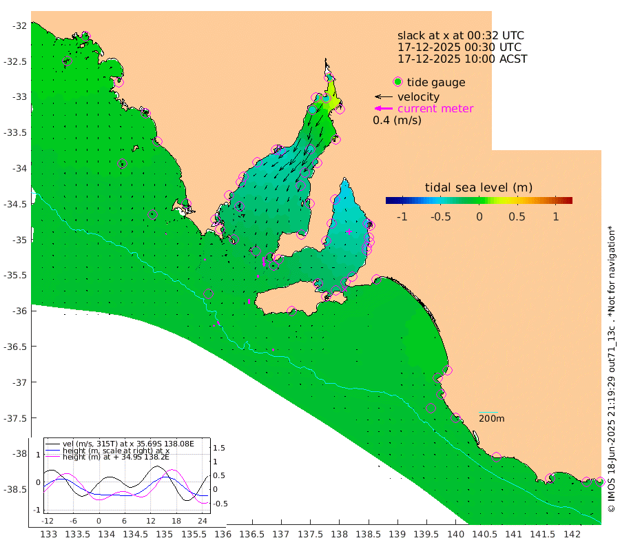 0cm/s -71T +10cm/s rms + 5cm/s 114T. SAM1DS 520m 3cm/s 113T +13cm/s rms + 5cm/s -36T. SAM2CP 100m 8cm/s 150T +21cm/s rms + 18cm/s 142T. SAM3MS 168m 5cm/s -163T +22cm/s rms + 0cm/s -30T. SAM4CY 117m 1cm/s 42T +23cm/s rms + 2cm/s 99T. SAM5CB 94m 5cm/s 179T +8cm/s rms + 3cm/s -172T. SAM6IS 83m 4cm/s 156T +11cm/s rms + 7cm/s 150T. SAM7DS 519m 20cm/s 174T +10cm/s rms + 2cm/s 87T. SAM8SG 47m 11cm/s -176T +20cm/s rms + 12cm/s -168T. NRSKAI 101m -13cm Warrnambool -13cm Port Fairy -13cm Portland -11cm Port Macdonnell -13cm Beachport -11cm Cape Rabelais (off) -11cm Robe -10cm Cape Jaffa -10cm Kingston -16cm Victor Harbor -13cm Vivonne Bay -35cm Kingscote -28cm American River -29cm Penneshaw -31cm Cape Jervis -36cm Second Valley -45cm Port Noarlunga -46cm Port Stanvac -44cm Brighton -48cm Glenelg -51cm Port Adelaide (Outer Harbor) -53cm Angus Inlet (Garden Island) -61cm Ardrossan -47cm Port Vincent -45cm Port Giles -17cm Stenhouse Bay -16cm Althorpe Island -14cm Pondalowie Bay -26cm Point Turton -25cm Port Victoria -27cm Cape Elizabeth -33cm Tiparra Reef Light -34cm Wallaroo -41cm Middle Bank 16cm Port Broughton -30cm Port Pirie -35cm Red Cliff Point (Beacon 5) -42cm Port Bonython -43cm Whyalla -42cm Western Shoal Beacon -36cm Franklin Harbor -45cm Franklin Harbor Entrance Beacon -39cm Arno Bay -37cm Port Neill -33cm Cape Hardy -29cm Tumby Bay -32cm Reevesby Island -26cm Port Lincoln -20cm Taylors Landing -22cm Whalers Bay -20cm Wedge Island Mooring -13cm Shelf Edge Mooring -12cm Coffin Bay Entrance Beacon -11cm Greenly Island -8cm Elliston -7cm Pearson Island -7cm Venus Bay -5cm Blanche Port (Streaky Bay) -7cm Thevenard 0cm St Francis Island
