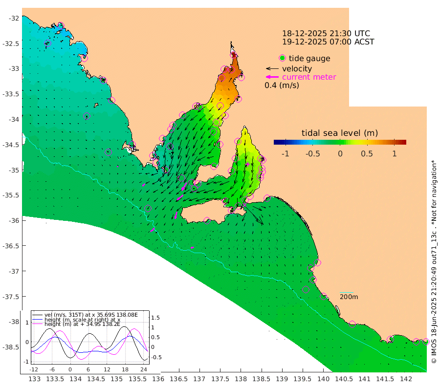 1cm/s -95T +10cm/s rms + 5cm/s 114T. SAM1DS 520m 9cm/s -134T +13cm/s rms + 5cm/s -36T. SAM2CP 100m 11cm/s -144T +21cm/s rms + 18cm/s 142T. SAM3MS 168m 10cm/s -103T +22cm/s rms + 0cm/s -30T. SAM4CY 117m 3cm/s 155T +23cm/s rms + 2cm/s 99T. SAM5CB 94m 25cm/s -129T +8cm/s rms + 3cm/s -172T. SAM6IS 83m 5cm/s -150T +11cm/s rms + 7cm/s 150T. SAM7DS 519m 30cm/s -147T +10cm/s rms + 2cm/s 87T. SAM8SG 47m 22cm/s -165T +20cm/s rms + 12cm/s -168T. NRSKAI 101m -2cm Warrnambool -3cm Port Fairy -6cm Portland -3cm Port Macdonnell -11cm Beachport -11cm Cape Rabelais (off) -10cm Robe -7cm Cape Jaffa -9cm Kingston -15cm Victor Harbor -20cm Vivonne Bay -1cm Kingscote 5cm American River -9cm Penneshaw 2cm Cape Jervis 15cm Second Valley 11cm Port Noarlunga 11cm Port Stanvac 12cm Brighton 12cm Glenelg 16cm Port Adelaide (Outer Harbor) 42cm Angus Inlet (Garden Island) 12cm Ardrossan -9cm Port Vincent -1cm Port Giles -18cm Stenhouse Bay -11cm Althorpe Island -12cm Pondalowie Bay -2cm Point Turton -2cm Port Victoria 4cm Cape Elizabeth 14cm Tiparra Reef Light 40cm Wallaroo 43cm Middle Bank 72cm Port Broughton 122cm Port Pirie 134cm Red Cliff Point (Beacon 5) 101cm Port Bonython 104cm Whyalla 93cm Western Shoal Beacon 37cm Franklin Harbor 1cm Franklin Harbor Entrance Beacon -15cm Arno Bay -25cm Port Neill -26cm Cape Hardy -30cm Tumby Bay -28cm Reevesby Island -33cm Port Lincoln -30cm Taylors Landing -11cm Whalers Bay -19cm Wedge Island Mooring -17cm Shelf Edge Mooring -25cm Coffin Bay Entrance Beacon -23cm Greenly Island -27cm Elliston -31cm Pearson Island -18cm Venus Bay -43cm Blanche Port (Streaky Bay) -45cm Thevenard -41cm St Francis Island