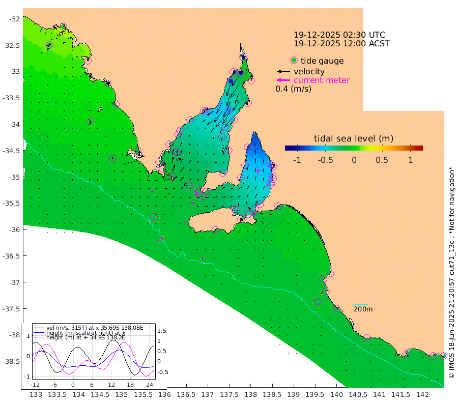 0cm/s -4T +10cm/s rms + 5cm/s 114T. SAM1DS 520m 6cm/s 86T +13cm/s rms + 5cm/s -36T. SAM2CP 100m 9cm/s 128T +21cm/s rms + 18cm/s 142T. SAM3MS 168m 7cm/s 162T +22cm/s rms + 0cm/s -30T. SAM4CY 117m 2cm/s 36T +23cm/s rms + 2cm/s 99T. SAM5CB 94m 9cm/s 80T +8cm/s rms + 3cm/s -172T. SAM6IS 83m 4cm/s 134T +11cm/s rms + 7cm/s 150T. SAM7DS 519m 20cm/s 154T +10cm/s rms + 2cm/s 87T. SAM8SG 47m 8cm/s 173T +20cm/s rms + 12cm/s -168T. NRSKAI 101m -19cm Warrnambool -18cm Port Fairy -17cm Portland -17cm Port Macdonnell -16cm Beachport -15cm Cape Rabelais (off) -13cm Robe -13cm Cape Jaffa -14cm Kingston -19cm Victor Harbor -14cm Vivonne Bay -45cm Kingscote -43cm American River -38cm Penneshaw -43cm Cape Jervis -56cm Second Valley -63cm Port Noarlunga -65cm Port Stanvac -64cm Brighton -66cm Glenelg -74cm Port Adelaide (Outer Harbor) -85cm Angus Inlet (Garden Island) -84cm Ardrossan -61cm Port Vincent -58cm Port Giles -18cm Stenhouse Bay -21cm Althorpe Island -16cm Pondalowie Bay -32cm Point Turton -30cm Port Victoria -38cm Cape Elizabeth -49cm Tiparra Reef Light -60cm Wallaroo -70cm Middle Bank -11cm Port Broughton -89cm Port Pirie -103cm Red Cliff Point (Beacon 5) -98cm Port Bonython -98cm Whyalla -91cm Western Shoal Beacon -56cm Franklin Harbor -57cm Franklin Harbor Entrance Beacon -45cm Arno Bay -42cm Port Neill -36cm Cape Hardy -30cm Tumby Bay -31cm Reevesby Island -22cm Port Lincoln -17cm Taylors Landing -25cm Whalers Bay -20cm Wedge Island Mooring -16cm Shelf Edge Mooring -10cm Coffin Bay Entrance Beacon -9cm Greenly Island -4cm Elliston -4cm Pearson Island -5cm Venus Bay 6cm Blanche Port (Streaky Bay) 6cm Thevenard 6cm St Francis Island