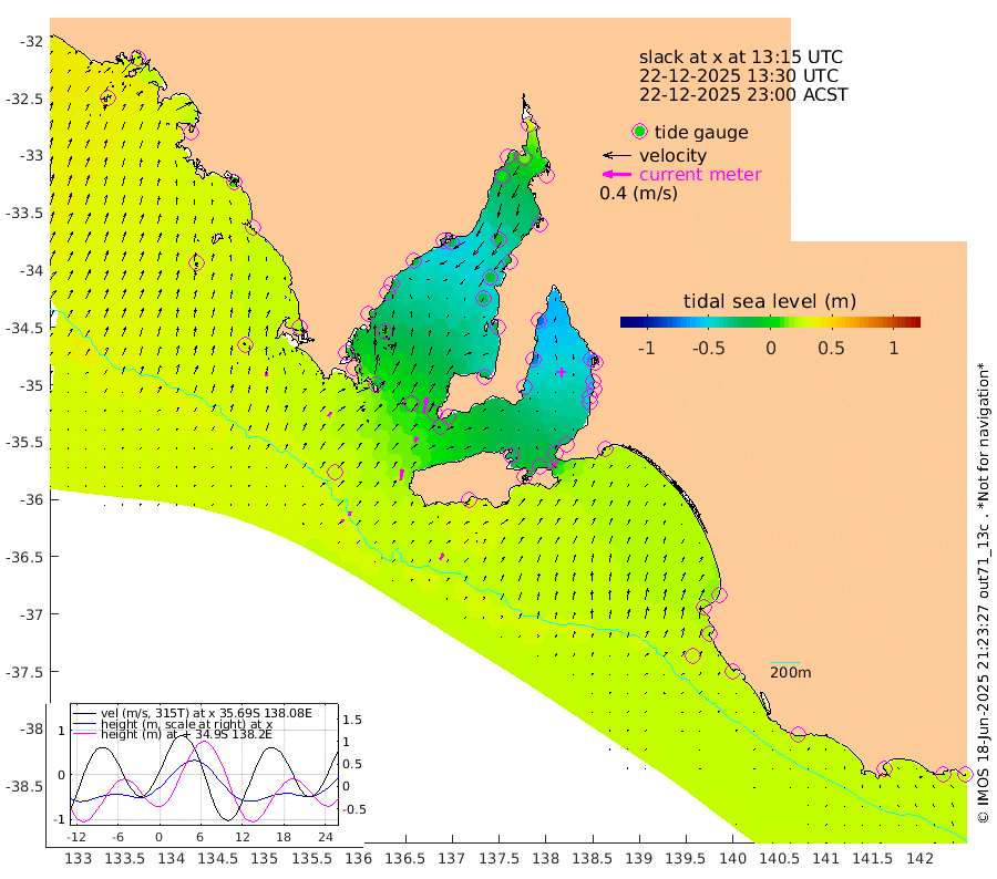 0cm/s 82T +10cm/s rms + 5cm/s 114T. SAM1DS 520m 7cm/s 34T +13cm/s rms + 5cm/s -36T. SAM2CP 100m 6cm/s 9T +21cm/s rms + 18cm/s 142T. SAM3MS 168m 10cm/s 32T +22cm/s rms + 0cm/s -30T. SAM4CY 117m 6cm/s 8T +23cm/s rms + 2cm/s 99T. SAM5CB 94m 7cm/s 22T +8cm/s rms + 3cm/s -172T. SAM6IS 83m 3cm/s -15T +11cm/s rms + 7cm/s 150T. SAM7DS 519m 22cm/s 14T +10cm/s rms + 2cm/s 87T. SAM8SG 47m 15cm/s 9T +20cm/s rms + 12cm/s -168T. NRSKAI 101m 25cm Warrnambool 22cm Port Fairy 24cm Portland 15cm Port Macdonnell 25cm Beachport 25cm Cape Rabelais (off) 22cm Robe 19cm Cape Jaffa 19cm Kingston 22cm Victor Harbor 30cm Vivonne Bay -24cm Kingscote -20cm American River -13cm Penneshaw -16cm Cape Jervis -30cm Second Valley -48cm Port Noarlunga -50cm Port Stanvac -50cm Brighton -55cm Glenelg -60cm Port Adelaide (Outer Harbor) -50cm Angus Inlet (Garden Island) -77cm Ardrossan -74cm Port Vincent -52cm Port Giles 0cm Stenhouse Bay 3cm Althorpe Island 1cm Pondalowie Bay -18cm Point Turton -21cm Port Victoria -23cm Cape Elizabeth -15cm Tiparra Reef Light -13cm Wallaroo -11cm Middle Bank -16cm Port Broughton 22cm Port Pirie 28cm Red Cliff Point (Beacon 5) 14cm Port Bonython 10cm Whyalla 7cm Western Shoal Beacon -32cm Franklin Harbor -19cm Franklin Harbor Entrance Beacon -14cm Arno Bay -16cm Port Neill -7cm Cape Hardy -2cm Tumby Bay -1cm Reevesby Island 4cm Port Lincoln 14cm Taylors Landing -8cm Whalers Bay 8cm Wedge Island Mooring 25cm Shelf Edge Mooring 21cm Coffin Bay Entrance Beacon 26cm Greenly Island 25cm Elliston 25cm Pearson Island 9cm Venus Bay 20cm Blanche Port (Streaky Bay) 25cm Thevenard 30cm St Francis Island