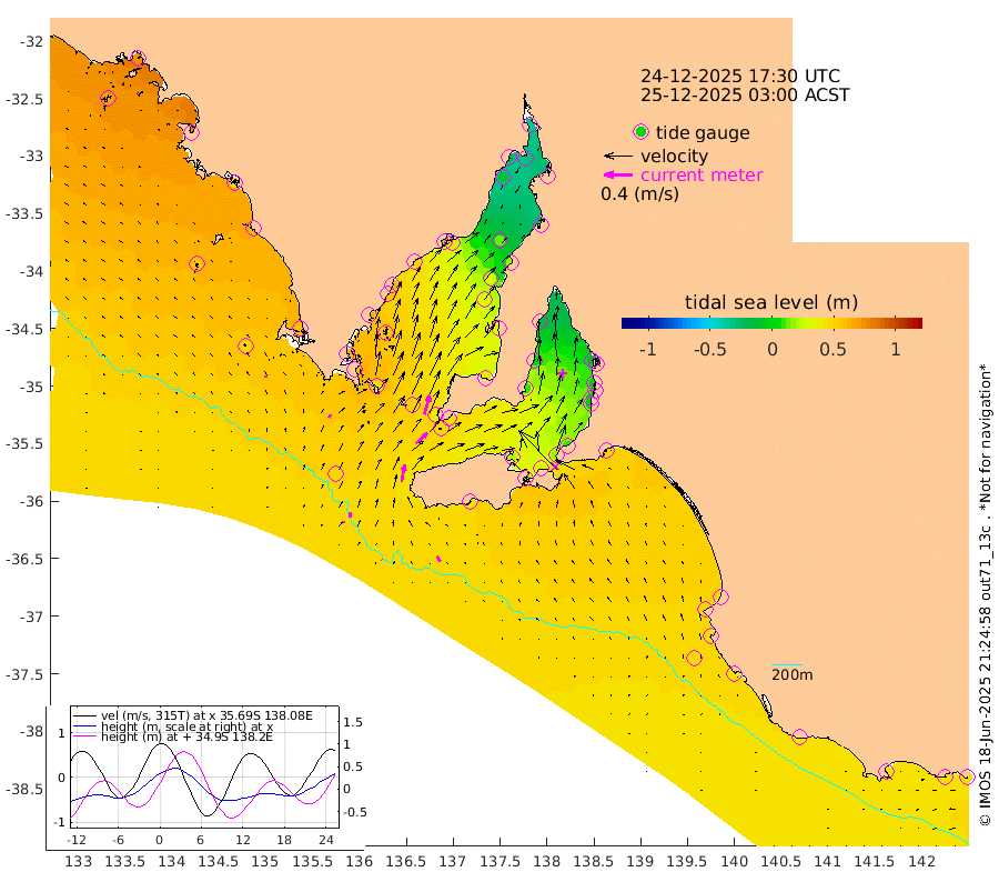 1cm/s -46T +10cm/s rms + 5cm/s 114T. SAM1DS 520m 5cm/s 25T +13cm/s rms + 5cm/s -36T. SAM2CP 100m 7cm/s 0T +21cm/s rms + 18cm/s 142T. SAM3MS 168m 8cm/s -37T +22cm/s rms + 0cm/s -30T. SAM4CY 117m 3cm/s -34T +23cm/s rms + 2cm/s 99T. SAM5CB 94m 21cm/s 48T +8cm/s rms + 3cm/s -172T. SAM6IS 83m 3cm/s -4T +11cm/s rms + 7cm/s 150T. SAM7DS 519m 28cm/s 16T +10cm/s rms + 2cm/s 87T. SAM8SG 47m 24cm/s 11T +20cm/s rms + 12cm/s -168T. NRSKAI 101m 45cm Warrnambool 43cm Port Fairy 44cm Portland 44cm Port Macdonnell 43cm Beachport 46cm Cape Rabelais (off) 45cm Robe 50cm Cape Jaffa 48cm Kingston 49cm Victor Harbor 45cm Vivonne Bay 21cm Kingscote 15cm American River 31cm Penneshaw 18cm Cape Jervis 9cm Second Valley 0cm Port Noarlunga -2cm Port Stanvac -3cm Brighton -1cm Glenelg -11cm Port Adelaide (Outer Harbor) -32cm Angus Inlet (Garden Island) -17cm Ardrossan 0cm Port Vincent 10cm Port Giles 43cm Stenhouse Bay 46cm Althorpe Island 39cm Pondalowie Bay 40cm Point Turton 36cm Port Victoria 34cm Cape Elizabeth 32cm Tiparra Reef Light 17cm Wallaroo 15cm Middle Bank -5cm Port Broughton -29cm Port Pirie -36cm Red Cliff Point (Beacon 5) -30cm Port Bonython -22cm Whyalla -13cm Western Shoal Beacon 15cm Franklin Harbor 44cm Franklin Harbor Entrance Beacon 50cm Arno Bay 61cm Port Neill 59cm Cape Hardy 63cm Tumby Bay 53cm Reevesby Island 61cm Port Lincoln 57cm Taylors Landing 44cm Whalers Bay 50cm Wedge Island Mooring 46cm Shelf Edge Mooring 57cm Coffin Bay Entrance Beacon 48cm Greenly Island 60cm Elliston 53cm Pearson Island 46cm Venus Bay 75cm Blanche Port (Streaky Bay) 74cm Thevenard 64cm St Francis Island