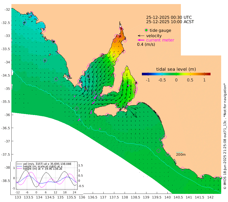 1cm/s -98T +10cm/s rms + 5cm/s 114T. SAM1DS 520m 8cm/s -138T +13cm/s rms + 5cm/s -36T. SAM2CP 100m 10cm/s -146T +21cm/s rms + 18cm/s 142T. SAM3MS 168m 8cm/s -112T +22cm/s rms + 0cm/s -30T. SAM4CY 117m 2cm/s 158T +23cm/s rms + 2cm/s 99T. SAM5CB 94m 20cm/s -128T +8cm/s rms + 3cm/s -172T. SAM6IS 83m 5cm/s -150T +11cm/s rms + 7cm/s 150T. SAM7DS 519m 27cm/s -145T +10cm/s rms + 2cm/s 87T. SAM8SG 47m 21cm/s -166T +20cm/s rms + 12cm/s -168T. NRSKAI 101m -8cm Warrnambool -8cm Port Fairy -10cm Portland -11cm Port Macdonnell -12cm Beachport -12cm Cape Rabelais (off) -12cm Robe -13cm Cape Jaffa -14cm Kingston -17cm Victor Harbor -20cm Vivonne Bay 3cm Kingscote 8cm American River -9cm Penneshaw 3cm Cape Jervis 13cm Second Valley 16cm Port Noarlunga 16cm Port Stanvac 18cm Brighton 15cm Glenelg 22cm Port Adelaide (Outer Harbor) 49cm Angus Inlet (Garden Island) 22cm Ardrossan 6cm Port Vincent 2cm Port Giles -19cm Stenhouse Bay -15cm Althorpe Island -12cm Pondalowie Bay -6cm Point Turton -4cm Port Victoria 1cm Cape Elizabeth 8cm Tiparra Reef Light 34cm Wallaroo 37cm Middle Bank 63cm Port Broughton 112cm Port Pirie 118cm Red Cliff Point (Beacon 5) 104cm Port Bonython 97cm Whyalla 80cm Western Shoal Beacon 23cm Franklin Harbor -8cm Franklin Harbor Entrance Beacon -18cm Arno Bay -26cm Port Neill -25cm Cape Hardy -30cm Tumby Bay -27cm Reevesby Island -34cm Port Lincoln -31cm Taylors Landing -15cm Whalers Bay -21cm Wedge Island Mooring -17cm Shelf Edge Mooring -27cm Coffin Bay Entrance Beacon -22cm Greenly Island -30cm Elliston -25cm Pearson Island -20cm Venus Bay -43cm Blanche Port (Streaky Bay) -45cm Thevenard -33cm St Francis Island