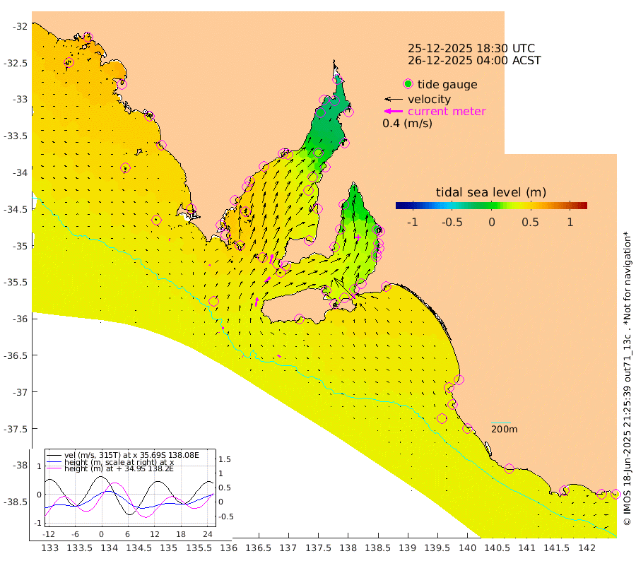 1cm/s -53T +10cm/s rms + 5cm/s 114T. SAM1DS 520m 3cm/s 21T +13cm/s rms + 5cm/s -36T. SAM2CP 100m 5cm/s -6T +21cm/s rms + 18cm/s 142T. SAM3MS 168m 8cm/s -50T +22cm/s rms + 0cm/s -30T. SAM4CY 117m 2cm/s -53T +23cm/s rms + 2cm/s 99T. SAM5CB 94m 16cm/s 49T +8cm/s rms + 3cm/s -172T. SAM6IS 83m 2cm/s -6T +11cm/s rms + 7cm/s 150T. SAM7DS 519m 21cm/s 15T +10cm/s rms + 2cm/s 87T. SAM8SG 47m 19cm/s 11T +20cm/s rms + 12cm/s -168T. NRSKAI 101m 35cm Warrnambool 34cm Port Fairy 34cm Portland 37cm Port Macdonnell 33cm Beachport 36cm Cape Rabelais (off) 35cm Robe 41cm Cape Jaffa 39cm Kingston 39cm Victor Harbor 33cm Vivonne Bay 22cm Kingscote 17cm American River 30cm Penneshaw 19cm Cape Jervis 15cm Second Valley 9cm Port Noarlunga 8cm Port Stanvac 7cm Brighton 9cm Glenelg 2cm Port Adelaide (Outer Harbor) -19cm Angus Inlet (Garden Island) 0cm Ardrossan 11cm Port Vincent 19cm Port Giles 38cm Stenhouse Bay 40cm Althorpe Island 33cm Pondalowie Bay 38cm Point Turton 35cm Port Victoria 34cm Cape Elizabeth 30cm Tiparra Reef Light 17cm Wallaroo 16cm Middle Bank -1cm Port Broughton -28cm Port Pirie -33cm Red Cliff Point (Beacon 5) -29cm Port Bonython -20cm Whyalla -11cm Western Shoal Beacon 20cm Franklin Harbor 43cm Franklin Harbor Entrance Beacon 46cm Arno Bay 56cm Port Neill 53cm Cape Hardy 55cm Tumby Bay 45cm Reevesby Island 52cm Port Lincoln 47cm Taylors Landing 40cm Whalers Bay 42cm Wedge Island Mooring 35cm Shelf Edge Mooring 45cm Coffin Bay Entrance Beacon 37cm Greenly Island 48cm Elliston 41cm Pearson Island 37cm Venus Bay 60cm Blanche Port (Streaky Bay) 58cm Thevenard 47cm St Francis Island