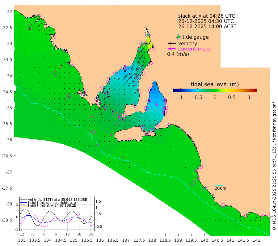 1cm/s -38T +10cm/s rms + 5cm/s 114T. SAM1DS 520m 5cm/s 85T +13cm/s rms + 5cm/s -36T. SAM2CP 100m 7cm/s 152T +21cm/s rms + 18cm/s 142T. SAM3MS 168m 5cm/s 168T +22cm/s rms + 0cm/s -30T. SAM4CY 117m 3cm/s 27T +23cm/s rms + 2cm/s 99T. SAM5CB 94m 5cm/s 80T +8cm/s rms + 3cm/s -172T. SAM6IS 83m 3cm/s 148T +11cm/s rms + 7cm/s 150T. SAM7DS 519m 16cm/s 165T +10cm/s rms + 2cm/s 87T. SAM8SG 47m 8cm/s -179T +20cm/s rms + 12cm/s -168T. NRSKAI 101m 2cm Warrnambool 0cm Port Fairy 0cm Portland -4cm Port Macdonnell -2cm Beachport -1cm Cape Rabelais (off) 0cm Robe -3cm Cape Jaffa -1cm Kingston -9cm Victor Harbor -3cm Vivonne Bay -44cm Kingscote -43cm American River -38cm Penneshaw -40cm Cape Jervis -56cm Second Valley -66cm Port Noarlunga -69cm Port Stanvac -71cm Brighton -71cm Glenelg -79cm Port Adelaide (Outer Harbor) -70cm Angus Inlet (Garden Island) -94cm Ardrossan -83cm Port Vincent -69cm Port Giles -18cm Stenhouse Bay -21cm Althorpe Island -12cm Pondalowie Bay -28cm Point Turton -28cm Port Victoria -37cm Cape Elizabeth -33cm Tiparra Reef Light -33cm Wallaroo -40cm Middle Bank 13cm Port Broughton -12cm Port Pirie -27cm Red Cliff Point (Beacon 5) -19cm Port Bonython -31cm Whyalla -36cm Western Shoal Beacon -44cm Franklin Harbor -52cm Franklin Harbor Entrance Beacon -44cm Arno Bay -42cm Port Neill -39cm Cape Hardy -36cm Tumby Bay -29cm Reevesby Island -24cm Port Lincoln -16cm Taylors Landing -26cm Whalers Bay -16cm Wedge Island Mooring -5cm Shelf Edge Mooring -5cm Coffin Bay Entrance Beacon -3cm Greenly Island -5cm Elliston 1cm Pearson Island -5cm Venus Bay -2cm Blanche Port (Streaky Bay) 0cm Thevenard 0cm St Francis Island