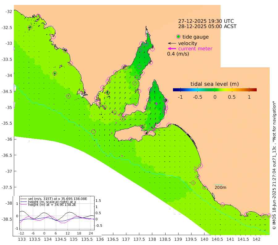 1cm/s -63T +10cm/s rms + 5cm/s 114T. SAM1DS 520m 1cm/s 40T +13cm/s rms + 5cm/s -36T. SAM2CP 100m 1cm/s -55T +21cm/s rms + 18cm/s 142T. SAM3MS 168m 5cm/s -69T +22cm/s rms + 0cm/s -30T. SAM4CY 117m 0cm/s -22T +23cm/s rms + 2cm/s 99T. SAM5CB 94m 5cm/s 61T +8cm/s rms + 3cm/s -172T. SAM6IS 83m 0cm/s -113T +11cm/s rms + 7cm/s 150T. SAM7DS 519m 3cm/s 37T +10cm/s rms + 2cm/s 87T. SAM8SG 47m 6cm/s 10T +20cm/s rms + 12cm/s -168T. NRSKAI 101m 17cm Warrnambool 16cm Port Fairy 15cm Portland 19cm Port Macdonnell 13cm Beachport 14cm Cape Rabelais (off) 14cm Robe 19cm Cape Jaffa 18cm Kingston 15cm Victor Harbor 11cm Vivonne Bay 1cm Kingscote 0cm American River 8cm Penneshaw 1cm Cape Jervis 2cm Second Valley -6cm Port Noarlunga -7cm Port Stanvac -8cm Brighton -6cm Glenelg -11cm Port Adelaide (Outer Harbor) -21cm Angus Inlet (Garden Island) -15cm Ardrossan -10cm Port Vincent -1cm Port Giles 13cm Stenhouse Bay 15cm Althorpe Island 11cm Pondalowie Bay 15cm Point Turton 12cm Port Victoria 13cm Cape Elizabeth 10cm Tiparra Reef Light 5cm Wallaroo 3cm Middle Bank 9cm Port Broughton -11cm Port Pirie -10cm Red Cliff Point (Beacon 5) -19cm Port Bonython -11cm Whyalla -6cm Western Shoal Beacon 11cm Franklin Harbor 16cm Franklin Harbor Entrance Beacon 14cm Arno Bay 18cm Port Neill 17cm Cape Hardy 19cm Tumby Bay 11cm Reevesby Island 17cm Port Lincoln 15cm Taylors Landing 13cm Whalers Bay 14cm Wedge Island Mooring 12cm Shelf Edge Mooring 16cm Coffin Bay Entrance Beacon 11cm Greenly Island 18cm Elliston 11cm Pearson Island 14cm Venus Bay 21cm Blanche Port (Streaky Bay) 19cm Thevenard 11cm St Francis Island