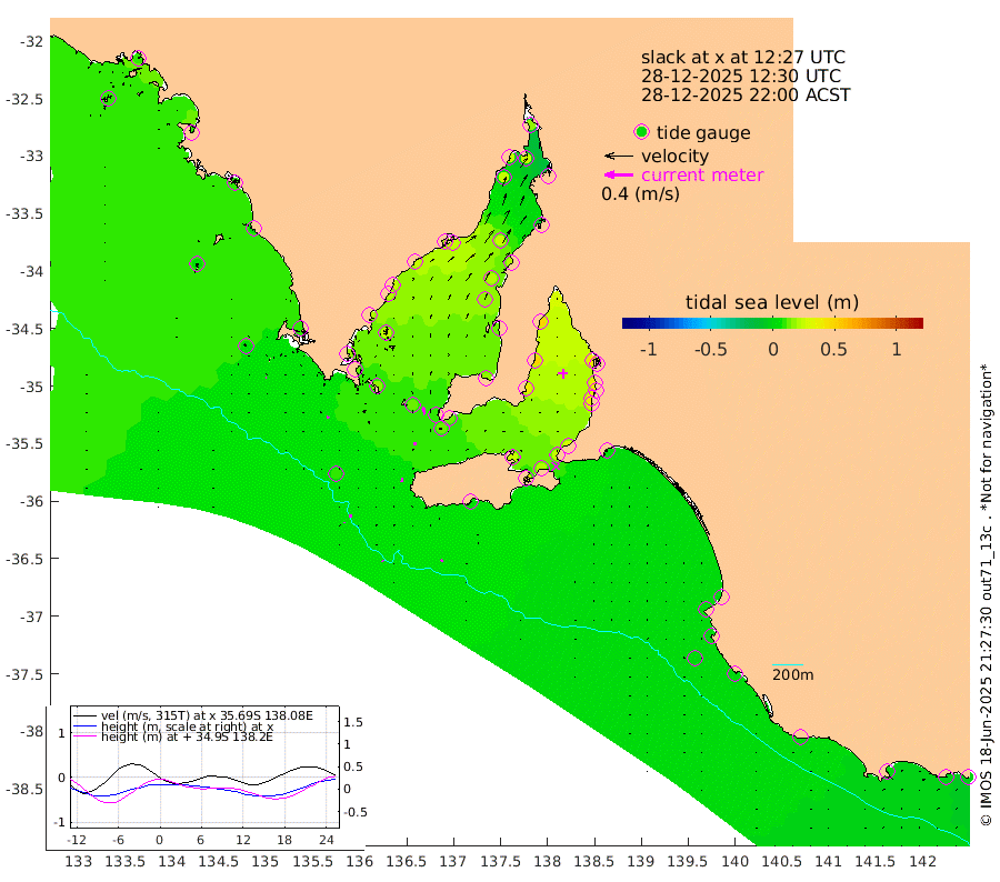 1cm/s 150T +10cm/s rms + 5cm/s 114T. SAM1DS 520m 3cm/s -70T +13cm/s rms + 5cm/s -36T. SAM2CP 100m 4cm/s -2T +21cm/s rms + 18cm/s 142T. SAM3MS 168m 3cm/s 42T +22cm/s rms + 0cm/s -30T. SAM4CY 117m 1cm/s -95T +23cm/s rms + 2cm/s 99T. SAM5CB 94m 4cm/s -96T +8cm/s rms + 3cm/s -172T. SAM6IS 83m 2cm/s -7T +11cm/s rms + 7cm/s 150T. SAM7DS 519m 10cm/s -10T +10cm/s rms + 2cm/s 87T. SAM8SG 47m 5cm/s 5T +20cm/s rms + 12cm/s -168T. NRSKAI 101m -1cm Warrnambool -1cm Port Fairy 1cm Portland 0cm Port Macdonnell 4cm Beachport 3cm Cape Rabelais (off) 3cm Robe 1cm Cape Jaffa 2cm Kingston 7cm Victor Harbor 7cm Vivonne Bay 26cm Kingscote 27cm American River 21cm Penneshaw 24cm Cape Jervis 28cm Second Valley 36cm Port Noarlunga 38cm Port Stanvac 39cm Brighton 38cm Glenelg 43cm Port Adelaide (Outer Harbor) 41cm Angus Inlet (Garden Island) 51cm Ardrossan 51cm Port Vincent 38cm Port Giles 12cm Stenhouse Bay 13cm Althorpe Island 10cm Pondalowie Bay 16cm Point Turton 14cm Port Victoria 17cm Cape Elizabeth 21cm Tiparra Reef Light 20cm Wallaroo 23cm Middle Bank -9cm Port Broughton 14cm Port Pirie 18cm Red Cliff Point (Beacon 5) 23cm Port Bonython 23cm Whyalla 26cm Western Shoal Beacon 21cm Franklin Harbor 26cm Franklin Harbor Entrance Beacon 24cm Arno Bay 24cm Port Neill 21cm Cape Hardy 19cm Tumby Bay 23cm Reevesby Island 16cm Port Lincoln 13cm Taylors Landing 16cm Whalers Bay 12cm Wedge Island Mooring 8cm Shelf Edge Mooring 9cm Coffin Bay Entrance Beacon 6cm Greenly Island 7cm Elliston 6cm Pearson Island 8cm Venus Bay 10cm Blanche Port (Streaky Bay) 10cm Thevenard 10cm St Francis Island