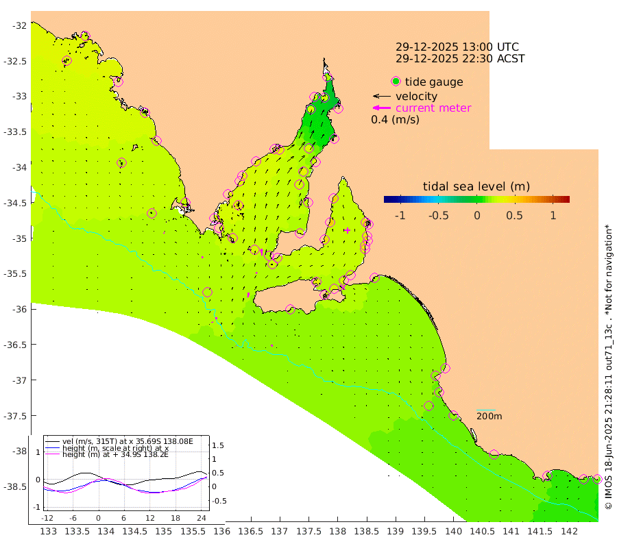 1cm/s 169T +10cm/s rms + 5cm/s 114T. SAM1DS 520m 3cm/s -57T +13cm/s rms + 5cm/s -36T. SAM2CP 100m 5cm/s -8T +21cm/s rms + 18cm/s 142T. SAM3MS 168m 3cm/s -17T +22cm/s rms + 0cm/s -30T. SAM4CY 117m 2cm/s -71T +23cm/s rms + 2cm/s 99T. SAM5CB 94m 3cm/s -18T +8cm/s rms + 3cm/s -172T. SAM6IS 83m 2cm/s -12T +11cm/s rms + 7cm/s 150T. SAM7DS 519m 16cm/s -5T +10cm/s rms + 2cm/s 87T. SAM8SG 47m 10cm/s 8T +20cm/s rms + 12cm/s -168T. NRSKAI 101m 12cm Warrnambool 11cm Port Fairy 14cm Portland 13cm Port Macdonnell 16cm Beachport 17cm Cape Rabelais (off) 17cm Robe 16cm Cape Jaffa 15cm Kingston 21cm Victor Harbor 19cm Vivonne Bay 34cm Kingscote 34cm American River 30cm Penneshaw 31cm Cape Jervis 33cm Second Valley 39cm Port Noarlunga 41cm Port Stanvac 41cm Brighton 41cm Glenelg 43cm Port Adelaide (Outer Harbor) 39cm Angus Inlet (Garden Island) 50cm Ardrossan 54cm Port Vincent 42cm Port Giles 24cm Stenhouse Bay 27cm Althorpe Island 22cm Pondalowie Bay 29cm Point Turton 26cm Port Victoria 29cm Cape Elizabeth 34cm Tiparra Reef Light 31cm Wallaroo 34cm Middle Bank 0cm Port Broughton 22cm Port Pirie 21cm Red Cliff Point (Beacon 5) 30cm Port Bonython 30cm Whyalla 33cm Western Shoal Beacon 28cm Franklin Harbor 38cm Franklin Harbor Entrance Beacon 38cm Arno Bay 40cm Port Neill 37cm Cape Hardy 35cm Tumby Bay 38cm Reevesby Island 33cm Port Lincoln 28cm Taylors Landing 29cm Whalers Bay 26cm Wedge Island Mooring 21cm Shelf Edge Mooring 25cm Coffin Bay Entrance Beacon 20cm Greenly Island 23cm Elliston 22cm Pearson Island 21cm Venus Bay 31cm Blanche Port (Streaky Bay) 30cm Thevenard 28cm St Francis Island