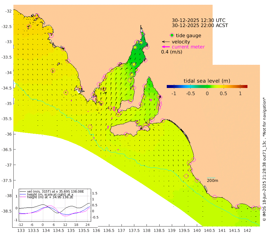 0cm/s 155T +10cm/s rms + 5cm/s 114T. SAM1DS 520m 4cm/s -11T +13cm/s rms + 5cm/s -36T. SAM2CP 100m 6cm/s -5T +21cm/s rms + 18cm/s 142T. SAM3MS 168m 5cm/s -17T +22cm/s rms + 0cm/s -30T. SAM4CY 117m 3cm/s -41T +23cm/s rms + 2cm/s 99T. SAM5CB 94m 6cm/s 27T +8cm/s rms + 3cm/s -172T. SAM6IS 83m 3cm/s -11T +11cm/s rms + 7cm/s 150T. SAM7DS 519m 23cm/s 5T +10cm/s rms + 2cm/s 87T. SAM8SG 47m 16cm/s 10T +20cm/s rms + 12cm/s -168T. NRSKAI 101m 24cm Warrnambool 23cm Port Fairy 27cm Portland 26cm Port Macdonnell 29cm Beachport 30cm Cape Rabelais (off) 29cm Robe 29cm Cape Jaffa 27cm Kingston 34cm Victor Harbor 33cm Vivonne Bay 33cm Kingscote 33cm American River 34cm Penneshaw 31cm Cape Jervis 29cm Second Valley 30cm Port Noarlunga 31cm Port Stanvac 31cm Brighton 30cm Glenelg 30cm Port Adelaide (Outer Harbor) 24cm Angus Inlet (Garden Island) 33cm Ardrossan 41cm Port Vincent 35cm Port Giles 34cm Stenhouse Bay 35cm Althorpe Island 31cm Pondalowie Bay 33cm Point Turton 30cm Port Victoria 31cm Cape Elizabeth 35cm Tiparra Reef Light 29cm Wallaroo 31cm Middle Bank -2cm Port Broughton 15cm Port Pirie 9cm Red Cliff Point (Beacon 5) 23cm Port Bonython 23cm Whyalla 25cm Western Shoal Beacon 23cm Franklin Harbor 40cm Franklin Harbor Entrance Beacon 44cm Arno Bay 46cm Port Neill 45cm Cape Hardy 45cm Tumby Bay 46cm Reevesby Island 44cm Port Lincoln 41cm Taylors Landing 36cm Whalers Bay 37cm Wedge Island Mooring 35cm Shelf Edge Mooring 39cm Coffin Bay Entrance Beacon 34cm Greenly Island 39cm Elliston 39cm Pearson Island 31cm Venus Bay 47cm Blanche Port (Streaky Bay) 47cm Thevenard 43cm St Francis Island