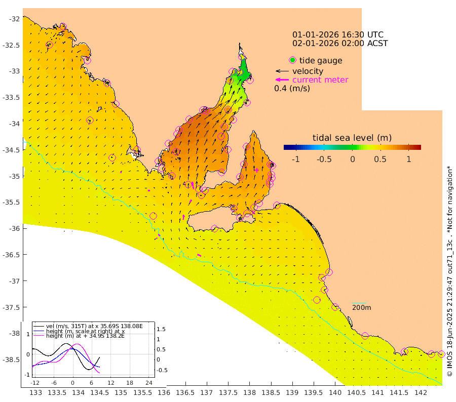 1cm/s -89T +10cm/s rms + 5cm/s 114T. SAM1DS 520m 6cm/s -92T +13cm/s rms + 5cm/s -36T. SAM2CP 100m 7cm/s -47T +21cm/s rms + 18cm/s 142T. SAM3MS 168m 12cm/s -67T +22cm/s rms + 0cm/s -30T. SAM4CY 117m 4cm/s -115T +23cm/s rms + 2cm/s 99T. SAM5CB 94m 8cm/s 39T +8cm/s rms + 3cm/s -172T. SAM6IS 83m 2cm/s -45T +11cm/s rms + 7cm/s 150T. SAM7DS 519m 22cm/s -13T +10cm/s rms + 2cm/s 87T. SAM8SG 47m 14cm/s 6T +20cm/s rms + 12cm/s -168T. NRSKAI 101m 39cm Warrnambool 37cm Port Fairy 39cm Portland 41cm Port Macdonnell 37cm Beachport 40cm Cape Rabelais (off) 40cm Robe 46cm Cape Jaffa 43cm Kingston 48cm Victor Harbor 35cm Vivonne Bay 70cm Kingscote 63cm American River 63cm Penneshaw 60cm Cape Jervis 65cm Second Valley 75cm Port Noarlunga 76cm Port Stanvac 76cm Brighton 79cm Glenelg 79cm Port Adelaide (Outer Harbor) 65cm Angus Inlet (Garden Island) 90cm Ardrossan 92cm Port Vincent 81cm Port Giles 55cm Stenhouse Bay 60cm Althorpe Island 50cm Pondalowie Bay 74cm Point Turton 71cm Port Victoria 74cm Cape Elizabeth 79cm Tiparra Reef Light 75cm Wallaroo 78cm Middle Bank 30cm Port Broughton 45cm Port Pirie 39cm Red Cliff Point (Beacon 5) 51cm Port Bonython 60cm Whyalla 66cm Western Shoal Beacon 76cm Franklin Harbor 91cm Franklin Harbor Entrance Beacon 86cm Arno Bay 92cm Port Neill 85cm Cape Hardy 82cm Tumby Bay 79cm Reevesby Island 72cm Port Lincoln 58cm Taylors Landing 69cm Whalers Bay 59cm Wedge Island Mooring 41cm Shelf Edge Mooring 53cm Coffin Bay Entrance Beacon 40cm Greenly Island 51cm Elliston 44cm Pearson Island 48cm Venus Bay 67cm Blanche Port (Streaky Bay) 62cm Thevenard 53cm St Francis Island