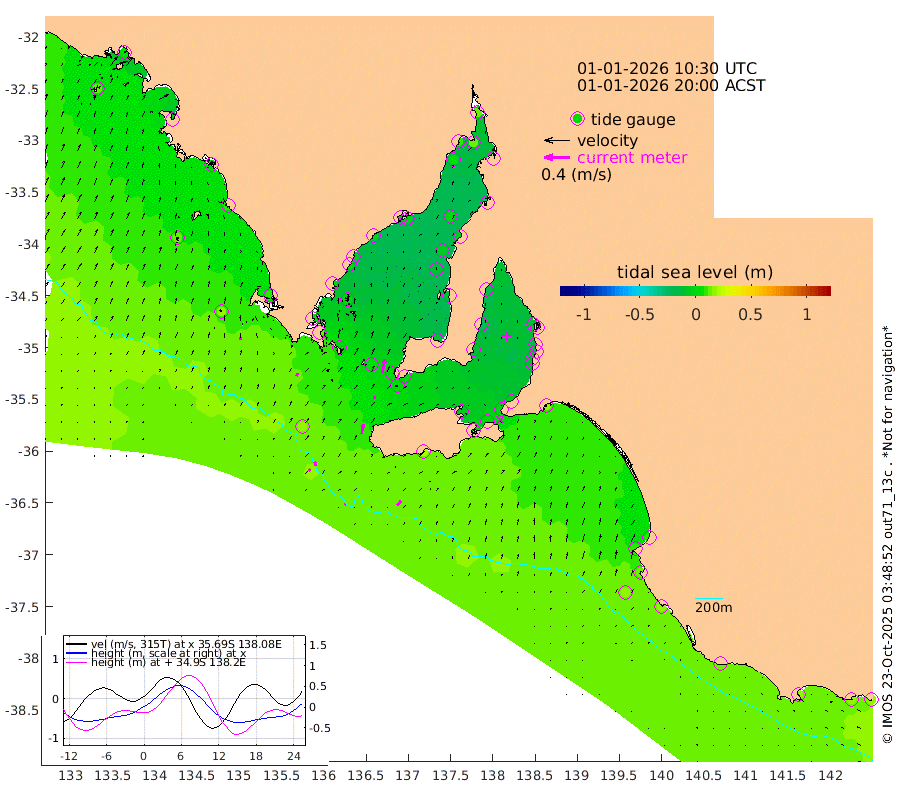 1cm/s 81T +10cm/s rms + 5cm/s 114T. SAM1DS 520m 5cm/s 29T +13cm/s rms + 5cm/s -36T. SAM2CP 100m 7cm/s -8T +21cm/s rms + 18cm/s 142T. SAM3MS 168m 9cm/s 40T +22cm/s rms + 0cm/s -30T. SAM4CY 117m 4cm/s 8T +23cm/s rms + 2cm/s 99T. SAM5CB 94m 4cm/s -5T +8cm/s rms + 3cm/s -172T. SAM6IS 83m 4cm/s -19T +11cm/s rms + 7cm/s 150T. SAM7DS 519m 22cm/s 11T +10cm/s rms + 2cm/s 87T. SAM8SG 47m 15cm/s 9T +20cm/s rms + 12cm/s -168T. NRSKAI 101m 16cm Warrnambool 16cm Port Fairy 17cm Portland 12cm Port Macdonnell 18cm Beachport 16cm Cape Rabelais (off) 14cm Robe 10cm Cape Jaffa 10cm Kingston 15cm Victor Harbor 21cm Vivonne Bay -6cm Kingscote -3cm American River 3cm Penneshaw 0cm Cape Jervis -5cm Second Valley -12cm Port Noarlunga -12cm Port Stanvac -13cm Brighton -16cm Glenelg -15cm Port Adelaide (Outer Harbor) -8cm Angus Inlet (Garden Island) -20cm Ardrossan -25cm Port Vincent -13cm Port Giles 4cm Stenhouse Bay 2cm Althorpe Island 1cm Pondalowie Bay -9cm Point Turton -9cm Port Victoria -9cm Cape Elizabeth -6cm Tiparra Reef Light -5cm Wallaroo 0cm Middle Bank -30cm Port Broughton 11cm Port Pirie 15cm Red Cliff Point (Beacon 5) 14cm Port Bonython 11cm Whyalla 5cm Western Shoal Beacon -13cm Franklin Harbor -2cm Franklin Harbor Entrance Beacon 0cm Arno Bay -4cm Port Neill 0cm Cape Hardy 2cm Tumby Bay 3cm Reevesby Island 7cm Port Lincoln 12cm Taylors Landing -3cm Whalers Bay 7cm Wedge Island Mooring 18cm Shelf Edge Mooring 10cm Coffin Bay Entrance Beacon 17cm Greenly Island 10cm Elliston 14cm Pearson Island 0cm Venus Bay 1cm Blanche Port (Streaky Bay) 5cm Thevenard 12cm St Francis Island