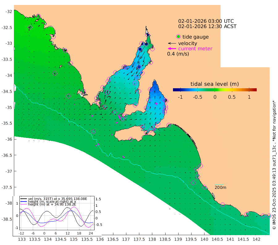 0cm/s 45T +10cm/s rms + 5cm/s 114T. SAM1DS 520m 7cm/s 78T +13cm/s rms + 5cm/s -36T. SAM2CP 100m 10cm/s 116T +21cm/s rms + 18cm/s 142T. SAM3MS 168m 11cm/s 138T +22cm/s rms + 0cm/s -30T. SAM4CY 117m 2cm/s 42T +23cm/s rms + 2cm/s 99T. SAM5CB 94m 11cm/s 71T +8cm/s rms + 3cm/s -172T. SAM6IS 83m 5cm/s 120T +11cm/s rms + 7cm/s 150T. SAM7DS 519m 21cm/s 148T +10cm/s rms + 2cm/s 87T. SAM8SG 47m 8cm/s 173T +20cm/s rms + 12cm/s -168T. NRSKAI 101m -38cm Warrnambool -35cm Port Fairy -34cm Portland -34cm Port Macdonnell -30cm Beachport -30cm Cape Rabelais (off) -29cm Robe -29cm Cape Jaffa -27cm Kingston -32cm Victor Harbor -24cm Vivonne Bay -49cm Kingscote -49cm American River -46cm Penneshaw -49cm Cape Jervis -60cm Second Valley -62cm Port Noarlunga -64cm Port Stanvac -64cm Brighton -63cm Glenelg -70cm Port Adelaide (Outer Harbor) -82cm Angus Inlet (Garden Island) -76cm Ardrossan -52cm Port Vincent -58cm Port Giles -28cm Stenhouse Bay -34cm Althorpe Island -25cm Pondalowie Bay -44cm Point Turton -42cm Port Victoria -49cm Cape Elizabeth -63cm Tiparra Reef Light -77cm Wallaroo -87cm Middle Bank -31cm Port Broughton -115cm Port Pirie -127cm Red Cliff Point (Beacon 5) -115cm Port Bonython -120cm Whyalla -112cm Western Shoal Beacon -70cm Franklin Harbor -68cm Franklin Harbor Entrance Beacon -54cm Arno Bay -50cm Port Neill -46cm Cape Hardy -41cm Tumby Bay -40cm Reevesby Island -33cm Port Lincoln -27cm Taylors Landing -37cm Whalers Bay -31cm Wedge Island Mooring -26cm Shelf Edge Mooring -20cm Coffin Bay Entrance Beacon -20cm Greenly Island -16cm Elliston -13cm Pearson Island -14cm Venus Bay -6cm Blanche Port (Streaky Bay) -4cm Thevenard -16cm St Francis Island