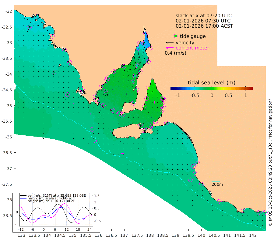 2cm/s 104T +10cm/s rms + 5cm/s 114T. SAM1DS 520m 2cm/s 74T +13cm/s rms + 5cm/s -36T. SAM2CP 100m 5cm/s 32T +21cm/s rms + 18cm/s 142T. SAM3MS 168m 13cm/s 91T +22cm/s rms + 0cm/s -30T. SAM4CY 117m 2cm/s 149T +23cm/s rms + 2cm/s 99T. SAM5CB 94m 1cm/s -30T +8cm/s rms + 3cm/s -172T. SAM6IS 83m 3cm/s 29T +11cm/s rms + 7cm/s 150T. SAM7DS 519m 8cm/s 53T +10cm/s rms + 2cm/s 87T. SAM8SG 47m 2cm/s 29T +20cm/s rms + 12cm/s -168T. NRSKAI 101m -35cm Warrnambool -32cm Port Fairy -34cm Portland -35cm Port Macdonnell -31cm Beachport -34cm Cape Rabelais (off) -35cm Robe -39cm Cape Jaffa -36cm Kingston -32cm Victor Harbor -26cm Vivonne Bay -16cm Kingscote -19cm American River -16cm Penneshaw -13cm Cape Jervis -11cm Second Valley -1cm Port Noarlunga 0cm Port Stanvac 0cm Brighton 3cm Glenelg 7cm Port Adelaide (Outer Harbor) 5cm Angus Inlet (Garden Island) 17cm Ardrossan 1cm Port Vincent 0cm Port Giles -26cm Stenhouse Bay -32cm Althorpe Island -30cm Pondalowie Bay -33cm Point Turton -28cm Port Victoria -30cm Cape Elizabeth -36cm Tiparra Reef Light -43cm Wallaroo -39cm Middle Bank -68cm Port Broughton -70cm Port Pirie -60cm Red Cliff Point (Beacon 5) -54cm Port Bonython -57cm Whyalla -54cm Western Shoal Beacon -33cm Franklin Harbor -25cm Franklin Harbor Entrance Beacon -23cm Arno Bay -25cm Port Neill -26cm Cape Hardy -27cm Tumby Bay -27cm Reevesby Island -27cm Port Lincoln -28cm Taylors Landing -30cm Whalers Bay -30cm Wedge Island Mooring -31cm Shelf Edge Mooring -36cm Coffin Bay Entrance Beacon -28cm Greenly Island -36cm Elliston -32cm Pearson Island -34cm Venus Bay -46cm Blanche Port (Streaky Bay) -41cm Thevenard -39cm St Francis Island