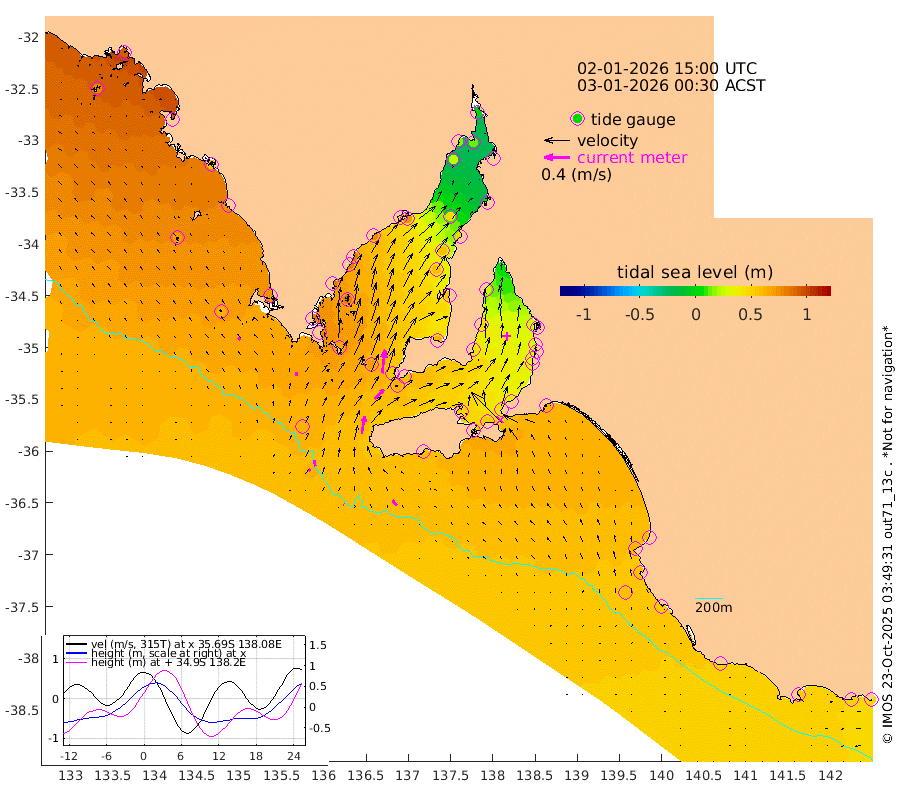 1cm/s -54T +10cm/s rms + 5cm/s 114T. SAM1DS 520m 5cm/s -1T +13cm/s rms + 5cm/s -36T. SAM2CP 100m 9cm/s -15T +21cm/s rms + 18cm/s 142T. SAM3MS 168m 11cm/s -40T +22cm/s rms + 0cm/s -30T. SAM4CY 117m 4cm/s -42T +23cm/s rms + 2cm/s 99T. SAM5CB 94m 21cm/s 43T +8cm/s rms + 3cm/s -172T. SAM6IS 83m 4cm/s -20T +11cm/s rms + 7cm/s 150T. SAM7DS 519m 37cm/s 7T +10cm/s rms + 2cm/s 87T. SAM8SG 47m 28cm/s 10T +20cm/s rms + 12cm/s -168T. NRSKAI 101m 51cm Warrnambool 50cm Port Fairy 54cm Portland 52cm Port Macdonnell 55cm Beachport 58cm Cape Rabelais (off) 56cm Robe 61cm Cape Jaffa 57cm Kingston 64cm Victor Harbor 57cm Vivonne Bay 50cm Kingscote 44cm American River 54cm Penneshaw 43cm Cape Jervis 36cm Second Valley 34cm Port Noarlunga 33cm Port Stanvac 33cm Brighton 33cm Glenelg 27cm Port Adelaide (Outer Harbor) 8cm Angus Inlet (Garden Island) 26cm Ardrossan 47cm Port Vincent 43cm Port Giles 59cm Stenhouse Bay 62cm Althorpe Island 55cm Pondalowie Bay 61cm Point Turton 58cm Port Victoria 58cm Cape Elizabeth 57cm Tiparra Reef Light 46cm Wallaroo 48cm Middle Bank 3cm Port Broughton 8cm Port Pirie -4cm Red Cliff Point (Beacon 5) 12cm Port Bonython 18cm Whyalla 24cm Western Shoal Beacon 42cm Franklin Harbor 71cm Franklin Harbor Entrance Beacon 75cm Arno Bay 82cm Port Neill 81cm Cape Hardy 83cm Tumby Bay 80cm Reevesby Island 81cm Port Lincoln 75cm Taylors Landing 64cm Whalers Bay 68cm Wedge Island Mooring 61cm Shelf Edge Mooring 73cm Coffin Bay Entrance Beacon 63cm Greenly Island 74cm Elliston 69cm Pearson Island 59cm Venus Bay 93cm Blanche Port (Streaky Bay) 91cm Thevenard 77cm St Francis Island