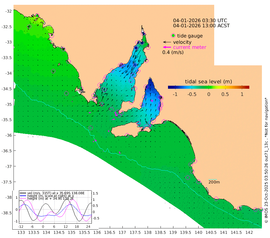 0cm/s 0T +10cm/s rms + 5cm/s 114T. SAM1DS 520m 8cm/s 80T +13cm/s rms + 5cm/s -36T. SAM2CP 100m 11cm/s 126T +21cm/s rms + 18cm/s 142T. SAM3MS 168m 11cm/s 151T +22cm/s rms + 0cm/s -30T. SAM4CY 117m 2cm/s 27T +23cm/s rms + 2cm/s 99T. SAM5CB 94m 12cm/s 76T +8cm/s rms + 3cm/s -172T. SAM6IS 83m 5cm/s 128T +11cm/s rms + 7cm/s 150T. SAM7DS 519m 24cm/s 153T +10cm/s rms + 2cm/s 87T. SAM8SG 47m 10cm/s 174T +20cm/s rms + 12cm/s -168T. NRSKAI 101m -24cm Warrnambool -24cm Port Fairy -22cm Portland -22cm Port Macdonnell -21cm Beachport -19cm Cape Rabelais (off) -17cm Robe -19cm Cape Jaffa -17cm Kingston -24cm Victor Harbor -17cm Vivonne Bay -55cm Kingscote -54cm American River -47cm Penneshaw -53cm Cape Jervis -69cm Second Valley -76cm Port Noarlunga -79cm Port Stanvac -80cm Brighton -80cm Glenelg -89cm Port Adelaide (Outer Harbor) -100cm Angus Inlet (Garden Island) -99cm Ardrossan -72cm Port Vincent -72cm Port Giles -23cm Stenhouse Bay -29cm Althorpe Island -20cm Pondalowie Bay -41cm Point Turton -41cm Port Victoria -50cm Cape Elizabeth -58cm Tiparra Reef Light -73cm Wallaroo -86cm Middle Bank -16cm Port Broughton -105cm Port Pirie -125cm Red Cliff Point (Beacon 5) -111cm Port Bonython -117cm Whyalla -109cm Western Shoal Beacon -72cm Franklin Harbor -72cm Franklin Harbor Entrance Beacon -57cm Arno Bay -51cm Port Neill -46cm Cape Hardy -40cm Tumby Bay -37cm Reevesby Island -29cm Port Lincoln -22cm Taylors Landing -34cm Whalers Bay -26cm Wedge Island Mooring -19cm Shelf Edge Mooring -12cm Coffin Bay Entrance Beacon -13cm Greenly Island -9cm Elliston -5cm Pearson Island -7cm Venus Bay 5cm Blanche Port (Streaky Bay) 5cm Thevenard 0cm St Francis Island