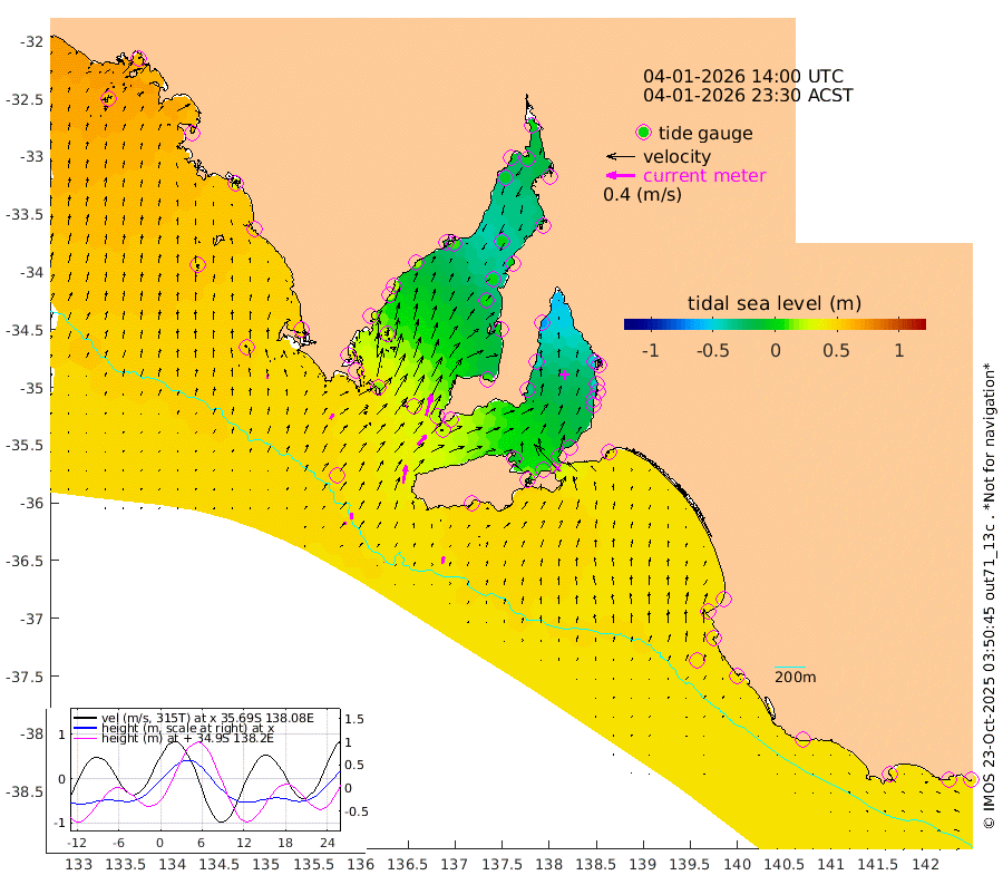 0cm/s 39T +10cm/s rms + 5cm/s 114T. SAM1DS 520m 9cm/s 31T +13cm/s rms + 5cm/s -36T. SAM2CP 100m 9cm/s 0T +21cm/s rms + 18cm/s 142T. SAM3MS 168m 10cm/s 9T +22cm/s rms + 0cm/s -30T. SAM4CY 117m 6cm/s -3T +23cm/s rms + 2cm/s 99T. SAM5CB 94m 18cm/s 42T +8cm/s rms + 3cm/s -172T. SAM6IS 83m 5cm/s -14T +11cm/s rms + 7cm/s 150T. SAM7DS 519m 32cm/s 15T +10cm/s rms + 2cm/s 87T. SAM8SG 47m 25cm/s 10T +20cm/s rms + 12cm/s -168T. NRSKAI 101m 42cm Warrnambool 40cm Port Fairy 43cm Portland 35cm Port Macdonnell 44cm Beachport 44cm Cape Rabelais (off) 41cm Robe 42cm Cape Jaffa 41cm Kingston 44cm Victor Harbor 47cm Vivonne Bay -4cm Kingscote -4cm American River 8cm Penneshaw -1cm Cape Jervis -17cm Second Valley -34cm Port Noarlunga -36cm Port Stanvac -37cm Brighton -41cm Glenelg -49cm Port Adelaide (Outer Harbor) -54cm Angus Inlet (Garden Island) -65cm Ardrossan -43cm Port Vincent -31cm Port Giles 23cm Stenhouse Bay 25cm Althorpe Island 22cm Pondalowie Bay 8cm Point Turton 3cm Port Victoria 5cm Cape Elizabeth 4cm Tiparra Reef Light -3cm Wallaroo -1cm Middle Bank -21cm Port Broughton 0cm Port Pirie 0cm Red Cliff Point (Beacon 5) -3cm Port Bonython -5cm Whyalla -6cm Western Shoal Beacon -11cm Franklin Harbor 10cm Franklin Harbor Entrance Beacon 15cm Arno Bay 19cm Port Neill 24cm Cape Hardy 29cm Tumby Bay 29cm Reevesby Island 35cm Port Lincoln 43cm Taylors Landing 16cm Whalers Bay 33cm Wedge Island Mooring 45cm Shelf Edge Mooring 48cm Coffin Bay Entrance Beacon 47cm Greenly Island 49cm Elliston 48cm Pearson Island 31cm Venus Bay 56cm Blanche Port (Streaky Bay) 57cm Thevenard 55cm St Francis Island