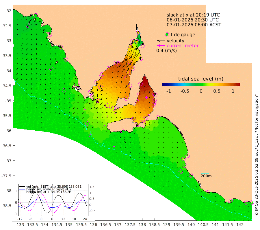 1cm/s -69T +10cm/s rms + 5cm/s 114T. SAM1DS 520m 9cm/s -114T +13cm/s rms + 5cm/s -36T. SAM2CP 100m 8cm/s -78T +21cm/s rms + 18cm/s 142T. SAM3MS 168m 11cm/s -81T +22cm/s rms + 0cm/s -30T. SAM4CY 117m 5cm/s -154T +23cm/s rms + 2cm/s 99T. SAM5CB 94m 6cm/s -113T +8cm/s rms + 3cm/s -172T. SAM6IS 83m 2cm/s -84T +11cm/s rms + 7cm/s 150T. SAM7DS 519m 13cm/s -52T +10cm/s rms + 2cm/s 87T. SAM8SG 47m 3cm/s -24T +20cm/s rms + 12cm/s -168T. NRSKAI 101m 8cm Warrnambool 10cm Port Fairy 8cm Portland 18cm Port Macdonnell 9cm Beachport 10cm Cape Rabelais (off) 9cm Robe 16cm Cape Jaffa 13cm Kingston 17cm Victor Harbor 3cm Vivonne Bay 72cm Kingscote 65cm American River 59cm Penneshaw 60cm Cape Jervis 82cm Second Valley 100cm Port Noarlunga 103cm Port Stanvac 104cm Brighton 109cm Glenelg 117cm Port Adelaide (Outer Harbor) 107cm Angus Inlet (Garden Island) 137cm Ardrossan 124cm Port Vincent 104cm Port Giles 35cm Stenhouse Bay 36cm Althorpe Island 30cm Pondalowie Bay 62cm Point Turton 64cm Port Victoria 72cm Cape Elizabeth 65cm Tiparra Reef Light 69cm Wallaroo 76cm Middle Bank 27cm Port Broughton 42cm Port Pirie 46cm Red Cliff Point (Beacon 5) 54cm Port Bonython 64cm Whyalla 64cm Western Shoal Beacon 83cm Franklin Harbor 85cm Franklin Harbor Entrance Beacon 74cm Arno Bay 74cm Port Neill 64cm Cape Hardy 57cm Tumby Bay 49cm Reevesby Island 42cm Port Lincoln 28cm Taylors Landing 50cm Whalers Bay 33cm Wedge Island Mooring 11cm Shelf Edge Mooring 14cm Coffin Bay Entrance Beacon 7cm Greenly Island 11cm Elliston 6cm Pearson Island 16cm Venus Bay 12cm Blanche Port (Streaky Bay) 7cm Thevenard -7cm St Francis Island