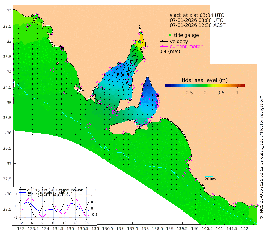 0cm/s -31T +10cm/s rms + 5cm/s 114T. SAM1DS 520m 5cm/s 88T +13cm/s rms + 5cm/s -36T. SAM2CP 100m 9cm/s 159T +21cm/s rms + 18cm/s 142T. SAM3MS 168m 5cm/s -162T +22cm/s rms + 0cm/s -30T. SAM4CY 117m 4cm/s 25T +23cm/s rms + 2cm/s 99T. SAM5CB 94m 4cm/s 104T +8cm/s rms + 3cm/s -172T. SAM6IS 83m 4cm/s 161T +11cm/s rms + 7cm/s 150T. SAM7DS 519m 20cm/s 171T +10cm/s rms + 2cm/s 87T. SAM8SG 47m 12cm/s -177T +20cm/s rms + 12cm/s -168T. NRSKAI 101m 6cm Warrnambool 5cm Port Fairy 5cm Portland 0cm Port Macdonnell 2cm Beachport 2cm Cape Rabelais (off) 4cm Robe 2cm Cape Jaffa 2cm Kingston -6cm Victor Harbor -1cm Vivonne Bay -53cm Kingscote -49cm American River -45cm Penneshaw -47cm Cape Jervis -65cm Second Valley -82cm Port Noarlunga -85cm Port Stanvac -85cm Brighton -89cm Glenelg -98cm Port Adelaide (Outer Harbor) -86cm Angus Inlet (Garden Island) -120cm Ardrossan -103cm Port Vincent -87cm Port Giles -20cm Stenhouse Bay -20cm Althorpe Island -13cm Pondalowie Bay -33cm Point Turton -33cm Port Victoria -41cm Cape Elizabeth -39cm Tiparra Reef Light -34cm Wallaroo -43cm Middle Bank 26cm Port Broughton 3cm Port Pirie -11cm Red Cliff Point (Beacon 5) -16cm Port Bonython -24cm Whyalla -30cm Western Shoal Beacon -45cm Franklin Harbor -60cm Franklin Harbor Entrance Beacon -54cm Arno Bay -55cm Port Neill -49cm Cape Hardy -44cm Tumby Bay -36cm Reevesby Island -29cm Port Lincoln -18cm Taylors Landing -29cm Whalers Bay -18cm Wedge Island Mooring -3cm Shelf Edge Mooring -3cm Coffin Bay Entrance Beacon 1cm Greenly Island 0cm Elliston 3cm Pearson Island -2cm Venus Bay 2cm Blanche Port (Streaky Bay) 4cm Thevenard 11cm St Francis Island