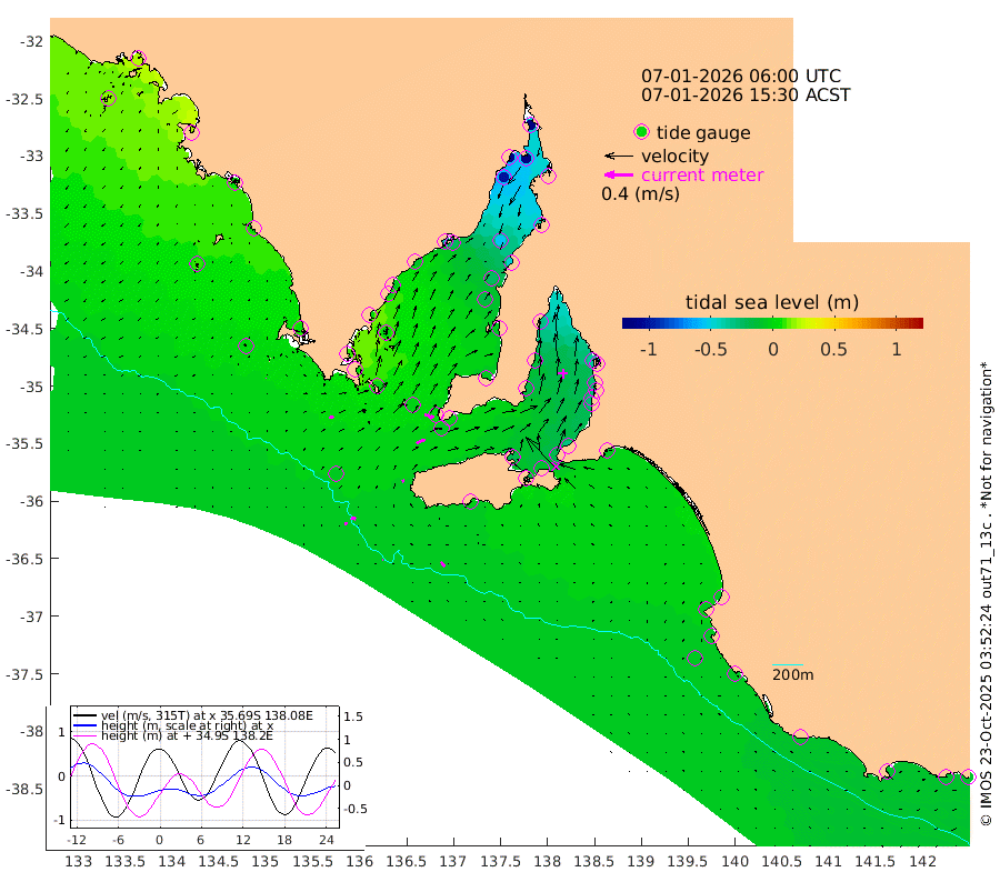 1cm/s 67T +10cm/s rms + 5cm/s 114T. SAM1DS 520m 6cm/s 72T +13cm/s rms + 5cm/s -36T. SAM2CP 100m 7cm/s 102T +21cm/s rms + 18cm/s 142T. SAM3MS 168m 8cm/s 143T +22cm/s rms + 0cm/s -30T. SAM4CY 117m 0cm/s -71T +23cm/s rms + 2cm/s 99T. SAM5CB 94m 13cm/s 66T +8cm/s rms + 3cm/s -172T. SAM6IS 83m 3cm/s 96T +11cm/s rms + 7cm/s 150T. SAM7DS 519m 13cm/s 106T +10cm/s rms + 2cm/s 87T. SAM8SG 47m 4cm/s 55T +20cm/s rms + 12cm/s -168T. NRSKAI 101m -11cm Warrnambool -9cm Port Fairy -8cm Portland -5cm Port Macdonnell -7cm Beachport -7cm Cape Rabelais (off) -4cm Robe -5cm Cape Jaffa -4cm Kingston -6cm Victor Harbor -3cm Vivonne Bay -19cm Kingscote -22cm American River -10cm Penneshaw -20cm Cape Jervis -31cm Second Valley -28cm Port Noarlunga -29cm Port Stanvac -32cm Brighton -29cm Glenelg -34cm Port Adelaide (Outer Harbor) -58cm Angus Inlet (Garden Island) -33cm Ardrossan -15cm Port Vincent -17cm Port Giles 4cm Stenhouse Bay -5cm Althorpe Island 0cm Pondalowie Bay -7cm Point Turton -6cm Port Victoria -16cm Cape Elizabeth -24cm Tiparra Reef Light -47cm Wallaroo -55cm Middle Bank -36cm Port Broughton -118cm Port Pirie -141cm Red Cliff Point (Beacon 5) -114cm Port Bonython -112cm Whyalla -99cm Western Shoal Beacon -38cm Franklin Harbor -24cm Franklin Harbor Entrance Beacon -10cm Arno Bay -4cm Port Neill -2cm Cape Hardy 1cm Tumby Bay 2cm Reevesby Island 8cm Port Lincoln 5cm Taylors Landing -2cm Whalers Bay -1cm Wedge Island Mooring -5cm Shelf Edge Mooring 4cm Coffin Bay Entrance Beacon 2cm Greenly Island 6cm Elliston 8cm Pearson Island 7cm Venus Bay 22cm Blanche Port (Streaky Bay) 21cm Thevenard 17cm St Francis Island
