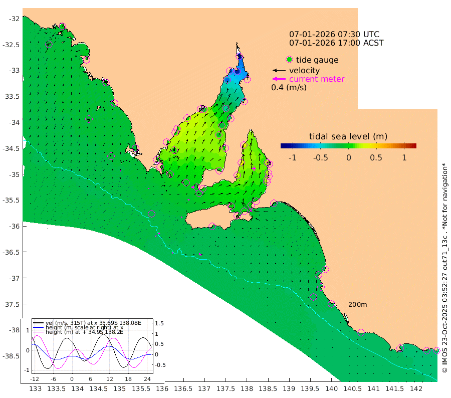 1cm/s 90T +10cm/s rms + 5cm/s 114T. SAM1DS 520m 2cm/s 77T +13cm/s rms + 5cm/s -36T. SAM2CP 100m 5cm/s 79T +21cm/s rms + 18cm/s 142T. SAM3MS 168m 9cm/s 124T +22cm/s rms + 0cm/s -30T. SAM4CY 117m 2cm/s -161T +23cm/s rms + 2cm/s 99T. SAM5CB 94m 5cm/s 77T +8cm/s rms + 3cm/s -172T. SAM6IS 83m 3cm/s 73T +11cm/s rms + 7cm/s 150T. SAM7DS 519m 9cm/s 97T +10cm/s rms + 2cm/s 87T. SAM8SG 47m 2cm/s 56T +20cm/s rms + 12cm/s -168T. NRSKAI 101m -28cm Warrnambool -25cm Port Fairy -25cm Portland -19cm Port Macdonnell -22cm Beachport -22cm Cape Rabelais (off) -20cm Robe -22cm Cape Jaffa -21cm Kingston -18cm Victor Harbor -16cm Vivonne Bay 4cm Kingscote 1cm American River 5cm Penneshaw 2cm Cape Jervis 3cm Second Valley 17cm Port Noarlunga 19cm Port Stanvac 18cm Brighton 22cm Glenelg 24cm Port Adelaide (Outer Harbor) 2cm Angus Inlet (Garden Island) 40cm Ardrossan 40cm Port Vincent 29cm Port Giles 2cm Stenhouse Bay -7cm Althorpe Island -5cm Pondalowie Bay -2cm Point Turton 1cm Port Victoria -5cm Cape Elizabeth -11cm Tiparra Reef Light -32cm Wallaroo -35cm Middle Bank -48cm Port Broughton -108cm Port Pirie -121cm Red Cliff Point (Beacon 5) -94cm Port Bonython -89cm Whyalla -75cm Western Shoal Beacon -19cm Franklin Harbor -4cm Franklin Harbor Entrance Beacon 5cm Arno Bay 7cm Port Neill 6cm Cape Hardy 6cm Tumby Bay 6cm Reevesby Island 6cm Port Lincoln -3cm Taylors Landing 1cm Whalers Bay -6cm Wedge Island Mooring -18cm Shelf Edge Mooring -13cm Coffin Bay Entrance Beacon -14cm Greenly Island -12cm Elliston -10cm Pearson Island -6cm Venus Bay -4cm Blanche Port (Streaky Bay) -4cm Thevenard -8cm St Francis Island