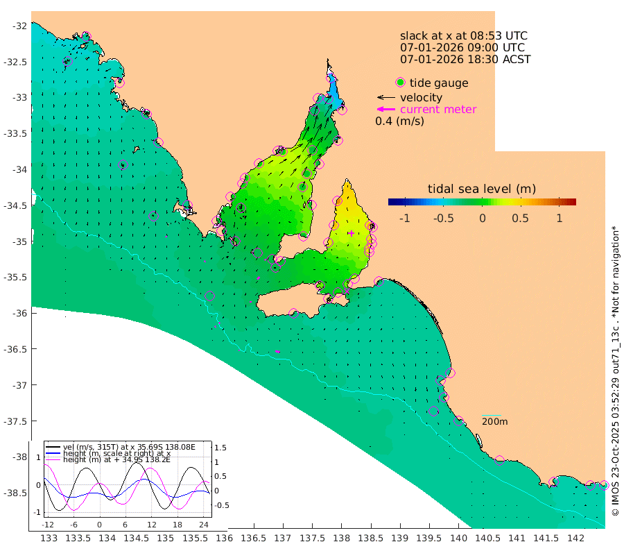 1cm/s 114T +10cm/s rms + 5cm/s 114T. SAM1DS 520m 2cm/s -122T +13cm/s rms + 5cm/s -36T. SAM2CP 100m 3cm/s 53T +21cm/s rms + 18cm/s 142T. SAM3MS 168m 10cm/s 106T +22cm/s rms + 0cm/s -30T. SAM4CY 117m 3cm/s -171T +23cm/s rms + 2cm/s 99T. SAM5CB 94m 7cm/s -130T +8cm/s rms + 3cm/s -172T. SAM6IS 83m 2cm/s 49T +11cm/s rms + 7cm/s 150T. SAM7DS 519m 2cm/s 138T +10cm/s rms + 2cm/s 87T. SAM8SG 47m 3cm/s -176T +20cm/s rms + 12cm/s -168T. NRSKAI 101m -40cm Warrnambool -37cm Port Fairy -37cm Portland -32cm Port Macdonnell -33cm Beachport -35cm Cape Rabelais (off) -33cm Robe -37cm Cape Jaffa -36cm Kingston -30cm Victor Harbor -28cm Vivonne Bay 12cm Kingscote 11cm American River 6cm Penneshaw 11cm Cape Jervis 23cm Second Valley 41cm Port Noarlunga 44cm Port Stanvac 44cm Brighton 48cm Glenelg 56cm Port Adelaide (Outer Harbor) 48cm Angus Inlet (Garden Island) 77cm Ardrossan 59cm Port Vincent 45cm Port Giles -11cm Stenhouse Bay -17cm Althorpe Island -16cm Pondalowie Bay -9cm Point Turton -6cm Port Victoria -7cm Cape Elizabeth -7cm Tiparra Reef Light -16cm Wallaroo -13cm Middle Bank -43cm Port Broughton -56cm Port Pirie -54cm Red Cliff Point (Beacon 5) -41cm Port Bonython -36cm Whyalla -28cm Western Shoal Beacon -6cm Franklin Harbor 0cm Franklin Harbor Entrance Beacon 1cm Arno Bay -3cm Port Neill -3cm Cape Hardy -7cm Tumby Bay -6cm Reevesby Island -12cm Port Lincoln -20cm Taylors Landing -8cm Whalers Bay -19cm Wedge Island Mooring -29cm Shelf Edge Mooring -32cm Coffin Bay Entrance Beacon -29cm Greenly Island -32cm Elliston -30cm Pearson Island -24cm Venus Bay -37cm Blanche Port (Streaky Bay) -36cm Thevenard -35cm St Francis Island