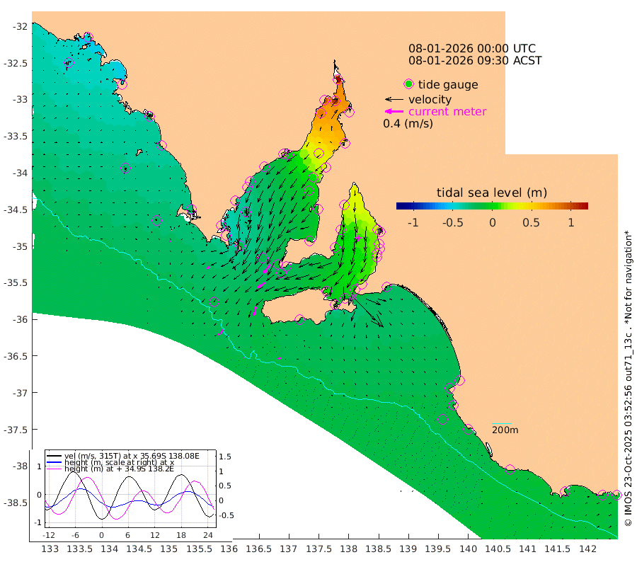 1cm/s -103T +10cm/s rms + 5cm/s 114T. SAM1DS 520m 8cm/s -134T +13cm/s rms + 5cm/s -36T. SAM2CP 100m 9cm/s -139T +21cm/s rms + 18cm/s 142T. SAM3MS 168m 7cm/s -108T +22cm/s rms + 0cm/s -30T. SAM4CY 117m 2cm/s 153T +23cm/s rms + 2cm/s 99T. SAM5CB 94m 19cm/s -125T +8cm/s rms + 3cm/s -172T. SAM6IS 83m 4cm/s -147T +11cm/s rms + 7cm/s 150T. SAM7DS 519m 24cm/s -142T +10cm/s rms + 2cm/s 87T. SAM8SG 47m 20cm/s -165T +20cm/s rms + 12cm/s -168T. NRSKAI 101m -13cm Warrnambool -13cm Port Fairy -15cm Portland -15cm Port Macdonnell -15cm Beachport -16cm Cape Rabelais (off) -17cm Robe -16cm Cape Jaffa -18cm Kingston -20cm Victor Harbor -22cm Vivonne Bay 5cm Kingscote 7cm American River -9cm Penneshaw 3cm Cape Jervis 16cm Second Valley 19cm Port Noarlunga 20cm Port Stanvac 23cm Brighton 21cm Glenelg 27cm Port Adelaide (Outer Harbor) 56cm Angus Inlet (Garden Island) 27cm Ardrossan 8cm Port Vincent 5cm Port Giles -21cm Stenhouse Bay -17cm Althorpe Island -14cm Pondalowie Bay -8cm Point Turton -5cm Port Victoria 0cm Cape Elizabeth 4cm Tiparra Reef Light 32cm Wallaroo 36cm Middle Bank 53cm Port Broughton 110cm Port Pirie 120cm Red Cliff Point (Beacon 5) 103cm Port Bonython 97cm Whyalla 80cm Western Shoal Beacon 26cm Franklin Harbor -5cm Franklin Harbor Entrance Beacon -17cm Arno Bay -28cm Port Neill -29cm Cape Hardy -33cm Tumby Bay -30cm Reevesby Island -36cm Port Lincoln -31cm Taylors Landing -17cm Whalers Bay -22cm Wedge Island Mooring -18cm Shelf Edge Mooring -29cm Coffin Bay Entrance Beacon -23cm Greenly Island -30cm Elliston -29cm Pearson Island -23cm Venus Bay -48cm Blanche Port (Streaky Bay) -47cm Thevenard -46cm St Francis Island