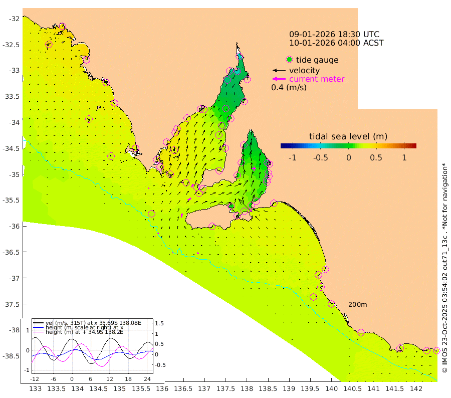 1cm/s -66T +10cm/s rms + 5cm/s 114T. SAM1DS 520m 3cm/s 49T +13cm/s rms + 5cm/s -36T. SAM2CP 100m 3cm/s 27T +21cm/s rms + 18cm/s 142T. SAM3MS 168m 5cm/s -70T +22cm/s rms + 0cm/s -30T. SAM4CY 117m 1cm/s -78T +23cm/s rms + 2cm/s 99T. SAM5CB 94m 11cm/s 61T +8cm/s rms + 3cm/s -172T. SAM6IS 83m 1cm/s 30T +11cm/s rms + 7cm/s 150T. SAM7DS 519m 10cm/s 30T +10cm/s rms + 2cm/s 87T. SAM8SG 47m 12cm/s 12T +20cm/s rms + 12cm/s -168T. NRSKAI 101m 28cm Warrnambool 27cm Port Fairy 26cm Portland 29cm Port Macdonnell 23cm Beachport 26cm Cape Rabelais (off) 25cm Robe 29cm Cape Jaffa 30cm Kingston 27cm Victor Harbor 22cm Vivonne Bay 7cm Kingscote 5cm American River 17cm Penneshaw 6cm Cape Jervis 1cm Second Valley -5cm Port Noarlunga -7cm Port Stanvac -9cm Brighton -7cm Glenelg -13cm Port Adelaide (Outer Harbor) -34cm Angus Inlet (Garden Island) -16cm Ardrossan -1cm Port Vincent 4cm Port Giles 26cm Stenhouse Bay 28cm Althorpe Island 23cm Pondalowie Bay 27cm Point Turton 22cm Port Victoria 22cm Cape Elizabeth 19cm Tiparra Reef Light 4cm Wallaroo 0cm Middle Bank 1cm Port Broughton -42cm Port Pirie -45cm Red Cliff Point (Beacon 5) -42cm Port Bonython -36cm Whyalla -27cm Western Shoal Beacon 8cm Franklin Harbor 24cm Franklin Harbor Entrance Beacon 28cm Arno Bay 41cm Port Neill 37cm Cape Hardy 39cm Tumby Bay 30cm Reevesby Island 36cm Port Lincoln 32cm Taylors Landing 26cm Whalers Bay 28cm Wedge Island Mooring 22cm Shelf Edge Mooring 32cm Coffin Bay Entrance Beacon 23cm Greenly Island 32cm Elliston 28cm Pearson Island 28cm Venus Bay 46cm Blanche Port (Streaky Bay) 42cm Thevenard 41cm St Francis Island