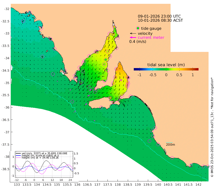 0cm/s -87T +10cm/s rms + 5cm/s 114T. SAM1DS 520m 7cm/s -125T +13cm/s rms + 5cm/s -36T. SAM2CP 100m 5cm/s -127T +21cm/s rms + 18cm/s 142T. SAM3MS 168m 5cm/s -128T +22cm/s rms + 0cm/s -30T. SAM4CY 117m 3cm/s -176T +23cm/s rms + 2cm/s 99T. SAM5CB 94m 13cm/s -124T +8cm/s rms + 3cm/s -172T. SAM6IS 83m 2cm/s -145T +11cm/s rms + 7cm/s 150T. SAM7DS 519m 15cm/s -139T +10cm/s rms + 2cm/s 87T. SAM8SG 47m 11cm/s -163T +20cm/s rms + 12cm/s -168T. NRSKAI 101m -24cm Warrnambool -22cm Port Fairy -24cm Portland -18cm Port Macdonnell -21cm Beachport -21cm Cape Rabelais (off) -22cm Robe -21cm Cape Jaffa -21cm Kingston -20cm Victor Harbor -24cm Vivonne Bay 25cm Kingscote 23cm American River 10cm Penneshaw 18cm Cape Jervis 36cm Second Valley 49cm Port Noarlunga 51cm Port Stanvac 54cm Brighton 54cm Glenelg 63cm Port Adelaide (Outer Harbor) 70cm Angus Inlet (Garden Island) 77cm Ardrossan 63cm Port Vincent 45cm Port Giles -8cm Stenhouse Bay -9cm Althorpe Island -7cm Pondalowie Bay 6cm Point Turton 8cm Port Victoria 16cm Cape Elizabeth 10cm Tiparra Reef Light 21cm Wallaroo 25cm Middle Bank 21cm Port Broughton 34cm Port Pirie 42cm Red Cliff Point (Beacon 5) 42cm Port Bonython 41cm Whyalla 34cm Western Shoal Beacon 27cm Franklin Harbor 13cm Franklin Harbor Entrance Beacon 6cm Arno Bay 2cm Port Neill -1cm Cape Hardy -6cm Tumby Bay -11cm Reevesby Island -16cm Port Lincoln -19cm Taylors Landing -3cm Whalers Bay -13cm Wedge Island Mooring -20cm Shelf Edge Mooring -26cm Coffin Bay Entrance Beacon -25cm Greenly Island -27cm Elliston -26cm Pearson Island -19cm Venus Bay -37cm Blanche Port (Streaky Bay) -39cm Thevenard -44cm St Francis Island