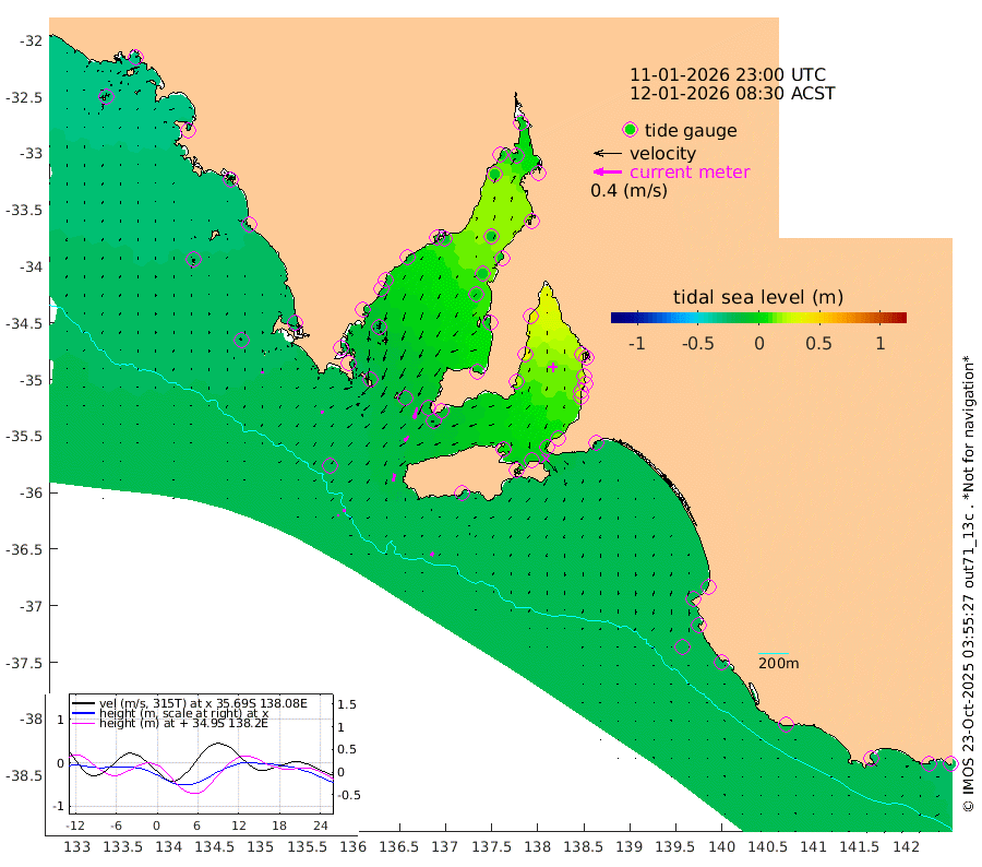 0cm/s -75T +10cm/s rms + 5cm/s 114T. SAM1DS 520m 4cm/s -143T +13cm/s rms + 5cm/s -36T. SAM2CP 100m 4cm/s 174T +21cm/s rms + 18cm/s 142T. SAM3MS 168m 5cm/s -155T +22cm/s rms + 0cm/s -30T. SAM4CY 117m 2cm/s 180T +23cm/s rms + 2cm/s 99T. SAM5CB 94m 9cm/s -139T +8cm/s rms + 3cm/s -172T. SAM6IS 83m 2cm/s 170T +11cm/s rms + 7cm/s 150T. SAM7DS 519m 16cm/s -164T +10cm/s rms + 2cm/s 87T. SAM8SG 47m 11cm/s -169T +20cm/s rms + 12cm/s -168T. NRSKAI 101m -25cm Warrnambool -23cm Port Fairy -24cm Portland -19cm Port Macdonnell -23cm Beachport -22cm Cape Rabelais (off) -22cm Robe -21cm Cape Jaffa -22cm Kingston -22cm Victor Harbor -24cm Vivonne Bay 6cm Kingscote 7cm American River -2cm Penneshaw 2cm Cape Jervis 14cm Second Valley 22cm Port Noarlunga 23cm Port Stanvac 25cm Brighton 24cm Glenelg 30cm Port Adelaide (Outer Harbor) 29cm Angus Inlet (Garden Island) 39cm Ardrossan 34cm Port Vincent 21cm Port Giles -11cm Stenhouse Bay -12cm Althorpe Island -11cm Pondalowie Bay -6cm Point Turton -5cm Port Victoria 0cm Cape Elizabeth -7cm Tiparra Reef Light -4cm Wallaroo -5cm Middle Bank 12cm Port Broughton -9cm Port Pirie -6cm Red Cliff Point (Beacon 5) -5cm Port Bonython -4cm Whyalla -6cm Western Shoal Beacon 2cm Franklin Harbor -8cm Franklin Harbor Entrance Beacon -10cm Arno Bay -10cm Port Neill -11cm Cape Hardy -13cm Tumby Bay -19cm Reevesby Island -20cm Port Lincoln -21cm Taylors Landing -10cm Whalers Bay -18cm Wedge Island Mooring -22cm Shelf Edge Mooring -26cm Coffin Bay Entrance Beacon -25cm Greenly Island -25cm Elliston -23cm Pearson Island -18cm Venus Bay -30cm Blanche Port (Streaky Bay) -33cm Thevenard -29cm St Francis Island
