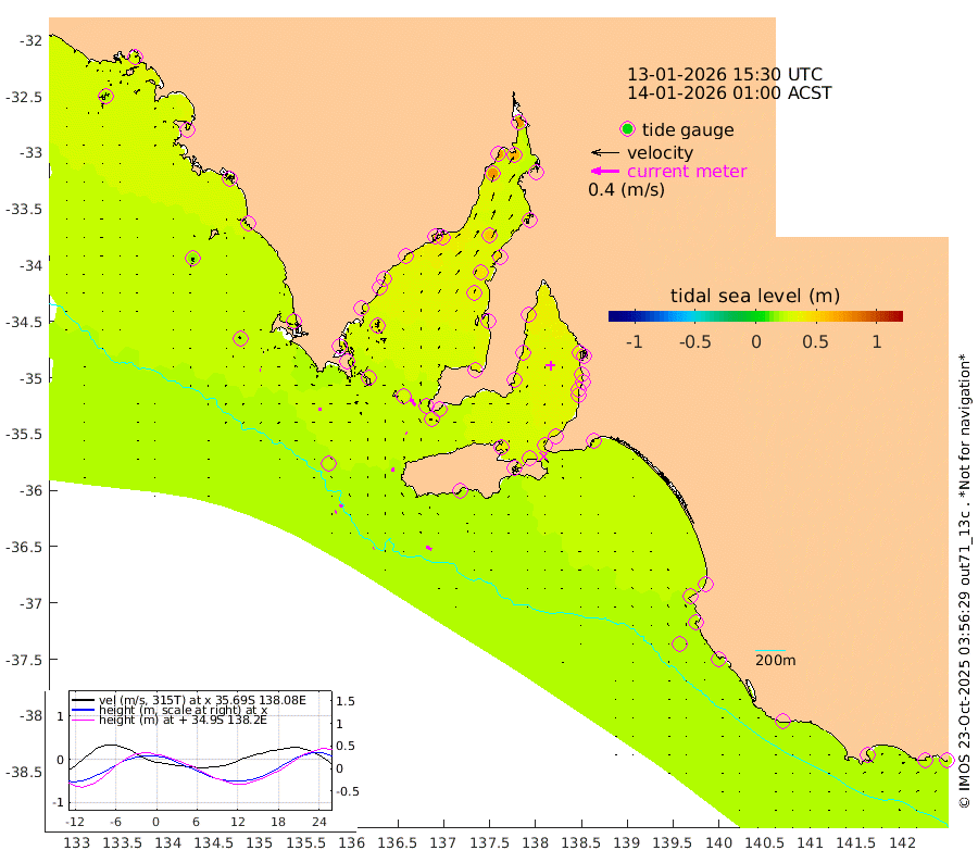1cm/s -109T +10cm/s rms + 5cm/s 114T. SAM1DS 520m 5cm/s -96T +13cm/s rms + 5cm/s -36T. SAM2CP 100m 6cm/s -67T +21cm/s rms + 18cm/s 142T. SAM3MS 168m 8cm/s -58T +22cm/s rms + 0cm/s -30T. SAM4CY 117m 1cm/s -109T +23cm/s rms + 2cm/s 99T. SAM5CB 94m 2cm/s -49T +8cm/s rms + 3cm/s -172T. SAM6IS 83m 3cm/s -71T +11cm/s rms + 7cm/s 150T. SAM7DS 519m 12cm/s -34T +10cm/s rms + 2cm/s 87T. SAM8SG 47m 4cm/s -8T +20cm/s rms + 12cm/s -168T. NRSKAI 101m 23cm Warrnambool 23cm Port Fairy 24cm Portland 22cm Port Macdonnell 22cm Beachport 22cm Cape Rabelais (off) 23cm Robe 27cm Cape Jaffa 24cm Kingston 26cm Victor Harbor 19cm Vivonne Bay 35cm Kingscote 32cm American River 29cm Penneshaw 31cm Cape Jervis 35cm Second Valley 36cm Port Noarlunga 36cm Port Stanvac 36cm Brighton 35cm Glenelg 37cm Port Adelaide (Outer Harbor) 38cm Angus Inlet (Garden Island) 38cm Ardrossan 37cm Port Vincent 33cm Port Giles 23cm Stenhouse Bay 27cm Althorpe Island 23cm Pondalowie Bay 35cm Point Turton 33cm Port Victoria 39cm Cape Elizabeth 44cm Tiparra Reef Light 52cm Wallaroo 56cm Middle Bank 31cm Port Broughton 71cm Port Pirie 74cm Red Cliff Point (Beacon 5) 63cm Port Bonython 71cm Whyalla 71cm Western Shoal Beacon 51cm Franklin Harbor 48cm Franklin Harbor Entrance Beacon 39cm Arno Bay 35cm Port Neill 37cm Cape Hardy 35cm Tumby Bay 38cm Reevesby Island 30cm Port Lincoln 26cm Taylors Landing 32cm Whalers Bay 28cm Wedge Island Mooring 23cm Shelf Edge Mooring 27cm Coffin Bay Entrance Beacon 22cm Greenly Island 25cm Elliston 18cm Pearson Island 24cm Venus Bay 30cm Blanche Port (Streaky Bay) 28cm Thevenard 22cm St Francis Island