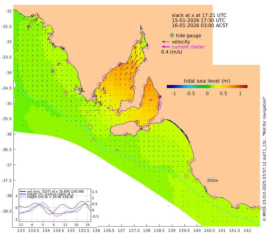 1cm/s -97T +10cm/s rms + 5cm/s 114T. SAM1DS 520m 7cm/s -113T +13cm/s rms + 5cm/s -36T. SAM2CP 100m 7cm/s -87T +21cm/s rms + 18cm/s 142T. SAM3MS 168m 11cm/s -78T +22cm/s rms + 0cm/s -30T. SAM4CY 117m 4cm/s -151T +23cm/s rms + 2cm/s 99T. SAM5CB 94m 4cm/s -113T +8cm/s rms + 3cm/s -172T. SAM6IS 83m 2cm/s -93T +11cm/s rms + 7cm/s 150T. SAM7DS 519m 11cm/s -56T +10cm/s rms + 2cm/s 87T. SAM8SG 47m 2cm/s -28T +20cm/s rms + 12cm/s -168T. NRSKAI 101m 26cm Warrnambool 25cm Port Fairy 24cm Portland 28cm Port Macdonnell 20cm Beachport 22cm Cape Rabelais (off) 23cm Robe 28cm Cape Jaffa 27cm Kingston 27cm Victor Harbor 14cm Vivonne Bay 50cm Kingscote 46cm American River 42cm Penneshaw 43cm Cape Jervis 52cm Second Valley 60cm Port Noarlunga 61cm Port Stanvac 59cm Brighton 62cm Glenelg 65cm Port Adelaide (Outer Harbor) 60cm Angus Inlet (Garden Island) 73cm Ardrossan 69cm Port Vincent 60cm Port Giles 31cm Stenhouse Bay 35cm Althorpe Island 30cm Pondalowie Bay 55cm Point Turton 53cm Port Victoria 59cm Cape Elizabeth 61cm Tiparra Reef Light 67cm Wallaroo 71cm Middle Bank 40cm Port Broughton 65cm Port Pirie 66cm Red Cliff Point (Beacon 5) 63cm Port Bonython 73cm Whyalla 74cm Western Shoal Beacon 73cm Franklin Harbor 70cm Franklin Harbor Entrance Beacon 59cm Arno Bay 58cm Port Neill 54cm Cape Hardy 49cm Tumby Bay 48cm Reevesby Island 40cm Port Lincoln 30cm Taylors Landing 44cm Whalers Bay 34cm Wedge Island Mooring 20cm Shelf Edge Mooring 26cm Coffin Bay Entrance Beacon 17cm Greenly Island 22cm Elliston 15cm Pearson Island 26cm Venus Bay 29cm Blanche Port (Streaky Bay) 24cm Thevenard 15cm St Francis Island