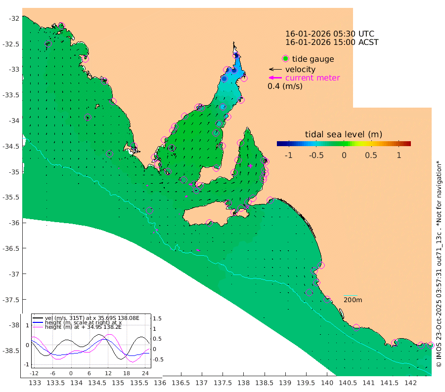 1cm/s 92T +10cm/s rms + 5cm/s 114T. SAM1DS 520m 4cm/s 78T +13cm/s rms + 5cm/s -36T. SAM2CP 100m 5cm/s 77T +21cm/s rms + 18cm/s 142T. SAM3MS 168m 12cm/s 108T +22cm/s rms + 0cm/s -30T. SAM4CY 117m 1cm/s 154T +23cm/s rms + 2cm/s 99T. SAM5CB 94m 7cm/s 55T +8cm/s rms + 3cm/s -172T. SAM6IS 83m 3cm/s 69T +11cm/s rms + 7cm/s 150T. SAM7DS 519m 9cm/s 93T +10cm/s rms + 2cm/s 87T. SAM8SG 47m 1cm/s 102T +20cm/s rms + 12cm/s -168T. NRSKAI 101m -33cm Warrnambool -30cm Port Fairy -31cm Portland -30cm Port Macdonnell -28cm Beachport -29cm Cape Rabelais (off) -28cm Robe -31cm Cape Jaffa -30cm Kingston -28cm Victor Harbor -22cm Vivonne Bay -21cm Kingscote -25cm American River -19cm Penneshaw -20cm Cape Jervis -23cm Second Valley -15cm Port Noarlunga -15cm Port Stanvac -16cm Brighton -13cm Glenelg -13cm Port Adelaide (Outer Harbor) -24cm Angus Inlet (Garden Island) -4cm Ardrossan -8cm Port Vincent -11cm Port Giles -19cm Stenhouse Bay -27cm Althorpe Island -22cm Pondalowie Bay -29cm Point Turton -24cm Port Victoria -31cm Cape Elizabeth -38cm Tiparra Reef Light -51cm Wallaroo -54cm Middle Bank -56cm Port Broughton -99cm Port Pirie -104cm Red Cliff Point (Beacon 5) -89cm Port Bonython -89cm Whyalla -81cm Western Shoal Beacon -46cm Franklin Harbor -34cm Franklin Harbor Entrance Beacon -24cm Arno Bay -25cm Port Neill -19cm Cape Hardy -18cm Tumby Bay -19cm Reevesby Island -18cm Port Lincoln -21cm Taylors Landing -23cm Whalers Bay -24cm Wedge Island Mooring -26cm Shelf Edge Mooring -25cm Coffin Bay Entrance Beacon -20cm Greenly Island -22cm Elliston -18cm Pearson Island -21cm Venus Bay -21cm Blanche Port (Streaky Bay) -18cm Thevenard -17cm St Francis Island