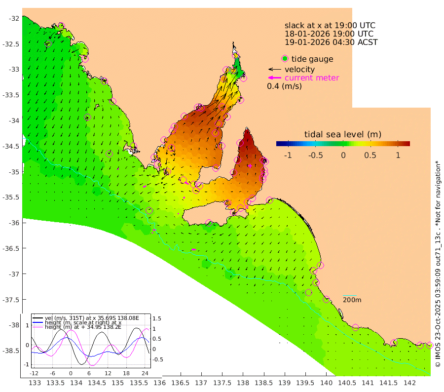 1cm/s -86T +10cm/s rms + 5cm/s 114T. SAM1DS 520m 10cm/s -117T +13cm/s rms + 5cm/s -36T. SAM2CP 100m 7cm/s -84T +21cm/s rms + 18cm/s 142T. SAM3MS 168m 13cm/s -85T +22cm/s rms + 0cm/s -30T. SAM4CY 117m 6cm/s -153T +23cm/s rms + 2cm/s 99T. SAM5CB 94m 5cm/s -128T +8cm/s rms + 3cm/s -172T. SAM6IS 83m 2cm/s -89T +11cm/s rms + 7cm/s 150T. SAM7DS 519m 13cm/s -57T +10cm/s rms + 2cm/s 87T. SAM8SG 47m 3cm/s -24T +20cm/s rms + 12cm/s -168T. NRSKAI 101m 21cm Warrnambool 22cm Port Fairy 19cm Portland 28cm Port Macdonnell 16cm Beachport 19cm Cape Rabelais (off) 19cm Robe 24cm Cape Jaffa 23cm Kingston 25cm Victor Harbor 9cm Vivonne Bay 76cm Kingscote 69cm American River 63cm Penneshaw 64cm Cape Jervis 81cm Second Valley 100cm Port Noarlunga 103cm Port Stanvac 102cm Brighton 107cm Glenelg 114cm Port Adelaide (Outer Harbor) 102cm Angus Inlet (Garden Island) 135cm Ardrossan 125cm Port Vincent 105cm Port Giles 42cm Stenhouse Bay 45cm Althorpe Island 37cm Pondalowie Bay 73cm Point Turton 72cm Port Victoria 80cm Cape Elizabeth 79cm Tiparra Reef Light 80cm Wallaroo 86cm Middle Bank 37cm Port Broughton 49cm Port Pirie 49cm Red Cliff Point (Beacon 5) 62cm Port Bonython 70cm Whyalla 72cm Western Shoal Beacon 91cm Franklin Harbor 93cm Franklin Harbor Entrance Beacon 82cm Arno Bay 87cm Port Neill 76cm Cape Hardy 68cm Tumby Bay 62cm Reevesby Island 52cm Port Lincoln 35cm Taylors Landing 59cm Whalers Bay 40cm Wedge Island Mooring 17cm Shelf Edge Mooring 23cm Coffin Bay Entrance Beacon 12cm Greenly Island 17cm Elliston 13cm Pearson Island 25cm Venus Bay 24cm Blanche Port (Streaky Bay) 17cm Thevenard 12cm St Francis Island