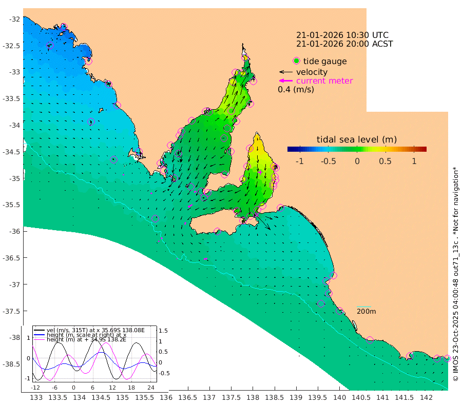 2cm/s 125T +10cm/s rms + 5cm/s 114T. SAM1DS 520m 4cm/s -116T +13cm/s rms + 5cm/s -36T. SAM2CP 100m 4cm/s -29T +21cm/s rms + 18cm/s 142T. SAM3MS 168m 10cm/s 77T +22cm/s rms + 0cm/s -30T. SAM4CY 117m 3cm/s 156T +23cm/s rms + 2cm/s 99T. SAM5CB 94m 14cm/s -120T +8cm/s rms + 3cm/s -172T. SAM6IS 83m 2cm/s -28T +11cm/s rms + 7cm/s 150T. SAM7DS 519m 6cm/s -106T +10cm/s rms + 2cm/s 87T. SAM8SG 47m 6cm/s -158T +20cm/s rms + 12cm/s -168T. NRSKAI 101m -35cm Warrnambool -33cm Port Fairy -33cm Portland -36cm Port Macdonnell -32cm Beachport -36cm Cape Rabelais (off) -35cm Robe -40cm Cape Jaffa -40cm Kingston -33cm Victor Harbor -30cm Vivonne Bay 6cm Kingscote 7cm American River -4cm Penneshaw 8cm Cape Jervis 23cm Second Valley 33cm Port Noarlunga 36cm Port Stanvac 38cm Brighton 36cm Glenelg 50cm Port Adelaide (Outer Harbor) 63cm Angus Inlet (Garden Island) 62cm Ardrossan 31cm Port Vincent 27cm Port Giles -28cm Stenhouse Bay -30cm Althorpe Island -31cm Pondalowie Bay -26cm Point Turton -23cm Port Victoria -16cm Cape Elizabeth -12cm Tiparra Reef Light -1cm Wallaroo 9cm Middle Bank -31cm Port Broughton 29cm Port Pirie 51cm Red Cliff Point (Beacon 5) 32cm Port Bonython 37cm Whyalla 33cm Western Shoal Beacon 5cm Franklin Harbor -6cm Franklin Harbor Entrance Beacon -17cm Arno Bay -29cm Port Neill -26cm Cape Hardy -31cm Tumby Bay -28cm Reevesby Island -36cm Port Lincoln -37cm Taylors Landing -26cm Whalers Bay -33cm Wedge Island Mooring -33cm Shelf Edge Mooring -46cm Coffin Bay Entrance Beacon -36cm Greenly Island -48cm Elliston -49cm Pearson Island -41cm Venus Bay -70cm Blanche Port (Streaky Bay) -67cm Thevenard -57cm St Francis Island