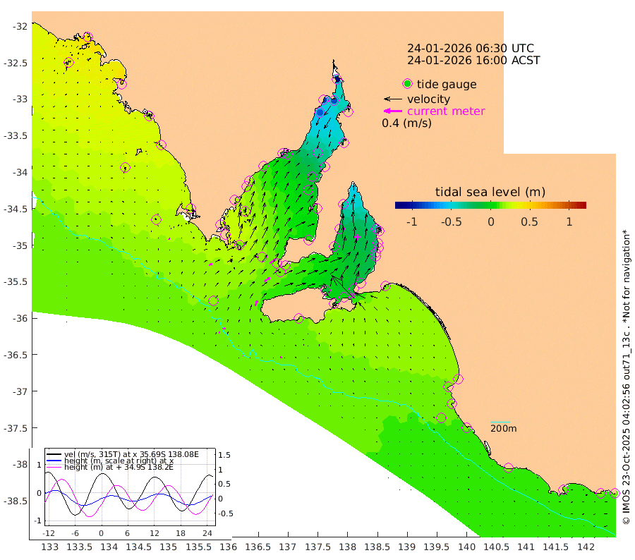 0cm/s 40T +10cm/s rms + 5cm/s 114T. SAM1DS 520m 7cm/s 58T +13cm/s rms + 5cm/s -36T. SAM2CP 100m 6cm/s 81T +21cm/s rms + 18cm/s 142T. SAM3MS 168m 4cm/s 125T +22cm/s rms + 0cm/s -30T. SAM4CY 117m 2cm/s -31T +23cm/s rms + 2cm/s 99T. SAM5CB 94m 15cm/s 55T +8cm/s rms + 3cm/s -172T. SAM6IS 83m 3cm/s 76T +11cm/s rms + 7cm/s 150T. SAM7DS 519m 16cm/s 56T +10cm/s rms + 2cm/s 87T. SAM8SG 47m 12cm/s 21T +20cm/s rms + 12cm/s -168T. NRSKAI 101m 12cm Warrnambool 12cm Port Fairy 13cm Portland 15cm Port Macdonnell 14cm Beachport 15cm Cape Rabelais (off) 16cm Robe 14cm Cape Jaffa 17cm Kingston 14cm Victor Harbor 17cm Vivonne Bay -12cm Kingscote -14cm American River 1cm Penneshaw -11cm Cape Jervis -25cm Second Valley -27cm Port Noarlunga -28cm Port Stanvac -32cm Brighton -28cm Glenelg -36cm Port Adelaide (Outer Harbor) -56cm Angus Inlet (Garden Island) -39cm Ardrossan -18cm Port Vincent -14cm Port Giles 18cm Stenhouse Bay 12cm Althorpe Island 16cm Pondalowie Bay 9cm Point Turton 8cm Port Victoria -3cm Cape Elizabeth -5cm Tiparra Reef Light -29cm Wallaroo -37cm Middle Bank -31cm Port Broughton -95cm Port Pirie -117cm Red Cliff Point (Beacon 5) -84cm Port Bonython -89cm Whyalla -79cm Western Shoal Beacon -28cm Franklin Harbor -5cm Franklin Harbor Entrance Beacon 10cm Arno Bay 20cm Port Neill 16cm Cape Hardy 20cm Tumby Bay 22cm Reevesby Island 28cm Port Lincoln 26cm Taylors Landing 12cm Whalers Bay 18cm Wedge Island Mooring 16cm Shelf Edge Mooring 26cm Coffin Bay Entrance Beacon 20cm Greenly Island 26cm Elliston 29cm Pearson Island 22cm Venus Bay 44cm Blanche Port (Streaky Bay) 44cm Thevenard 34cm St Francis Island