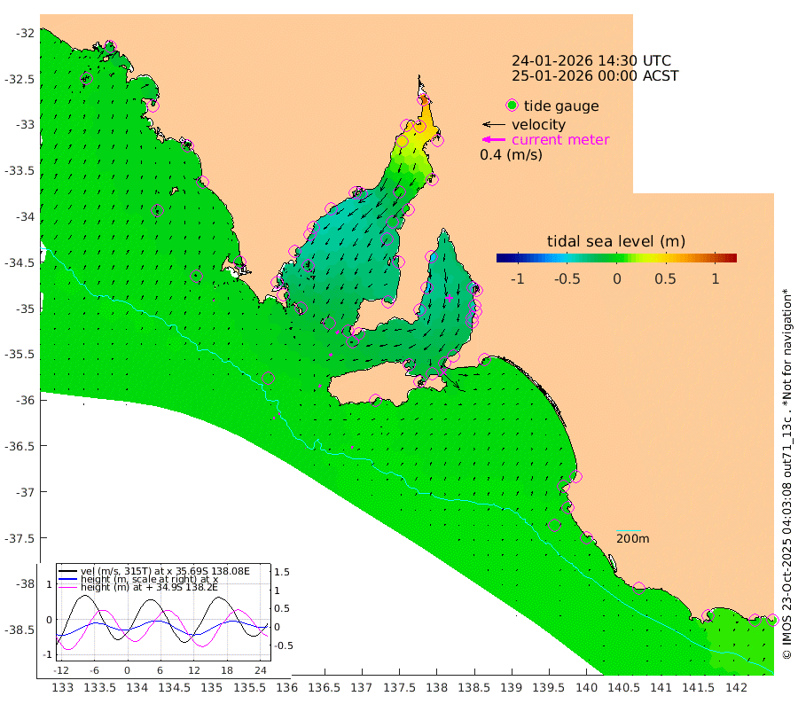 1cm/s -143T +10cm/s rms + 5cm/s 114T. SAM1DS 520m 0cm/s -88T +13cm/s rms + 5cm/s -36T. SAM2CP 100m 2cm/s -94T +21cm/s rms + 18cm/s 142T. SAM3MS 168m 4cm/s 3T +22cm/s rms + 0cm/s -30T. SAM4CY 117m 3cm/s 38T +23cm/s rms + 2cm/s 99T. SAM5CB 94m 5cm/s -123T +8cm/s rms + 3cm/s -172T. SAM6IS 83m 2cm/s -95T +11cm/s rms + 7cm/s 150T. SAM7DS 519m 6cm/s -126T +10cm/s rms + 2cm/s 87T. SAM8SG 47m 5cm/s -155T +20cm/s rms + 12cm/s -168T. NRSKAI 101m 9cm Warrnambool 7cm Port Fairy 7cm Portland -1cm Port Macdonnell 4cm Beachport 3cm Cape Rabelais (off) 3cm Robe 2cm Cape Jaffa 3cm Kingston 1cm Victor Harbor 3cm Vivonne Bay -22cm Kingscote -17cm American River -21cm Penneshaw -16cm Cape Jervis -21cm Second Valley -33cm Port Noarlunga -36cm Port Stanvac -36cm Brighton -40cm Glenelg -40cm Port Adelaide (Outer Harbor) -23cm Angus Inlet (Garden Island) -54cm Ardrossan -54cm Port Vincent -45cm Port Giles -18cm Stenhouse Bay -12cm Althorpe Island -13cm Pondalowie Bay -21cm Point Turton -25cm Port Victoria -19cm Cape Elizabeth -10cm Tiparra Reef Light 5cm Wallaroo 6cm Middle Bank 20cm Port Broughton 72cm Port Pirie 87cm Red Cliff Point (Beacon 5) 54cm Port Bonython 53cm Whyalla 47cm Western Shoal Beacon -5cm Franklin Harbor -21cm Franklin Harbor Entrance Beacon -28cm Arno Bay -34cm Port Neill -26cm Cape Hardy -26cm Tumby Bay -19cm Reevesby Island -23cm Port Lincoln -14cm Taylors Landing -19cm Whalers Bay -12cm Wedge Island Mooring 1cm Shelf Edge Mooring -3cm Coffin Bay Entrance Beacon 0cm Greenly Island -5cm Elliston -7cm Pearson Island -6cm Venus Bay -11cm Blanche Port (Streaky Bay) -10cm Thevenard -1cm St Francis Island