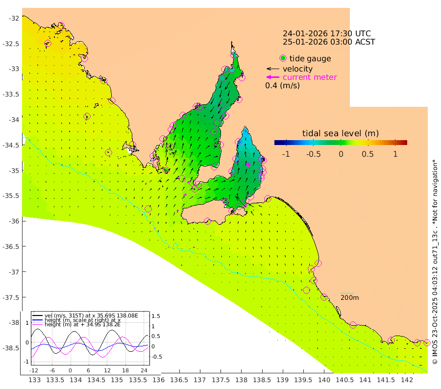 1cm/s -60T +10cm/s rms + 5cm/s 114T. SAM1DS 520m 5cm/s 56T +13cm/s rms + 5cm/s -36T. SAM2CP 100m 2cm/s 75T +21cm/s rms + 18cm/s 142T. SAM3MS 168m 4cm/s -50T +22cm/s rms + 0cm/s -30T. SAM4CY 117m 2cm/s 8T +23cm/s rms + 2cm/s 99T. SAM5CB 94m 9cm/s 63T +8cm/s rms + 3cm/s -172T. SAM6IS 83m 0cm/s 103T +11cm/s rms + 7cm/s 150T. SAM7DS 519m 8cm/s 55T +10cm/s rms + 2cm/s 87T. SAM8SG 47m 9cm/s 14T +20cm/s rms + 12cm/s -168T. NRSKAI 101m 27cm Warrnambool 25cm Port Fairy 25cm Portland 26cm Port Macdonnell 22cm Beachport 23cm Cape Rabelais (off) 24cm Robe 28cm Cape Jaffa 28cm Kingston 23cm Victor Harbor 21cm Vivonne Bay -20cm Kingscote -18cm American River -6cm Penneshaw -16cm Cape Jervis -28cm Second Valley -44cm Port Noarlunga -46cm Port Stanvac -49cm Brighton -49cm Glenelg -58cm Port Adelaide (Outer Harbor) -72cm Angus Inlet (Garden Island) -73cm Ardrossan -53cm Port Vincent -38cm Port Giles 12cm Stenhouse Bay 14cm Althorpe Island 13cm Pondalowie Bay 7cm Point Turton 3cm Port Victoria 2cm Cape Elizabeth -2cm Tiparra Reef Light -12cm Wallaroo -17cm Middle Bank 3cm Port Broughton -32cm Port Pirie -35cm Red Cliff Point (Beacon 5) -45cm Port Bonython -38cm Whyalla -31cm Western Shoal Beacon -10cm Franklin Harbor -1cm Franklin Harbor Entrance Beacon 3cm Arno Bay 9cm Port Neill 12cm Cape Hardy 16cm Tumby Bay 12cm Reevesby Island 20cm Port Lincoln 22cm Taylors Landing 9cm Whalers Bay 18cm Wedge Island Mooring 20cm Shelf Edge Mooring 29cm Coffin Bay Entrance Beacon 23cm Greenly Island 31cm Elliston 25cm Pearson Island 24cm Venus Bay 43cm Blanche Port (Streaky Bay) 42cm Thevenard 33cm St Francis Island