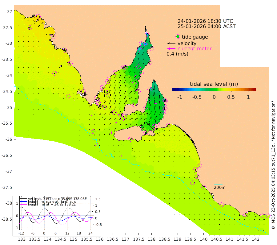 1cm/s -61T +10cm/s rms + 5cm/s 114T. SAM1DS 520m 4cm/s 54T +13cm/s rms + 5cm/s -36T. SAM2CP 100m 2cm/s 62T +21cm/s rms + 18cm/s 142T. SAM3MS 168m 4cm/s -76T +22cm/s rms + 0cm/s -30T. SAM4CY 117m 1cm/s -29T +23cm/s rms + 2cm/s 99T. SAM5CB 94m 10cm/s 62T +8cm/s rms + 3cm/s -172T. SAM6IS 83m 1cm/s 90T +11cm/s rms + 7cm/s 150T. SAM7DS 519m 9cm/s 49T +10cm/s rms + 2cm/s 87T. SAM8SG 47m 11cm/s 14T +20cm/s rms + 12cm/s -168T. NRSKAI 101m 21cm Warrnambool 20cm Port Fairy 20cm Portland 25cm Port Macdonnell 18cm Beachport 20cm Cape Rabelais (off) 21cm Robe 26cm Cape Jaffa 25cm Kingston 21cm Victor Harbor 18cm Vivonne Bay -4cm Kingscote -5cm American River 7cm Penneshaw -4cm Cape Jervis -11cm Second Valley -19cm Port Noarlunga -21cm Port Stanvac -23cm Brighton -21cm Glenelg -29cm Port Adelaide (Outer Harbor) -50cm Angus Inlet (Garden Island) -36cm Ardrossan -18cm Port Vincent -10cm Port Giles 20cm Stenhouse Bay 20cm Althorpe Island 18cm Pondalowie Bay 19cm Point Turton 16cm Port Victoria 15cm Cape Elizabeth 7cm Tiparra Reef Light -8cm Wallaroo -13cm Middle Bank -3cm Port Broughton -56cm Port Pirie -62cm Red Cliff Point (Beacon 5) -62cm Port Bonython -52cm Whyalla -42cm Western Shoal Beacon 0cm Franklin Harbor 15cm Franklin Harbor Entrance Beacon 19cm Arno Bay 26cm Port Neill 26cm Cape Hardy 29cm Tumby Bay 22cm Reevesby Island 30cm Port Lincoln 27cm Taylors Landing 20cm Whalers Bay 23cm Wedge Island Mooring 18cm Shelf Edge Mooring 28cm Coffin Bay Entrance Beacon 21cm Greenly Island 31cm Elliston 24cm Pearson Island 25cm Venus Bay 44cm Blanche Port (Streaky Bay) 42cm Thevenard 29cm St Francis Island