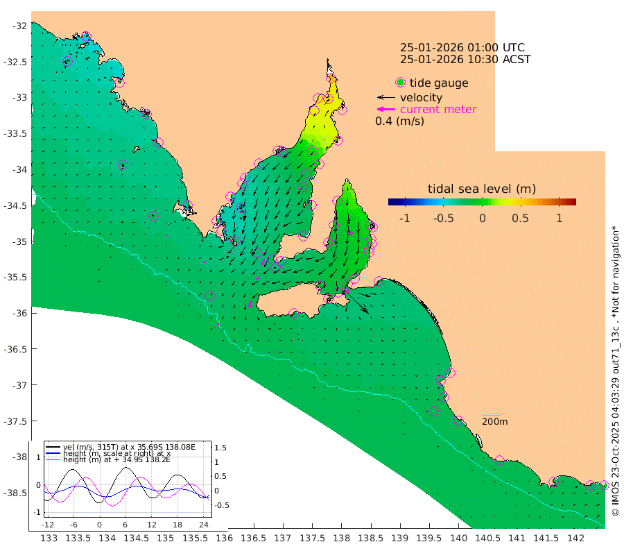 0cm/s 98T +10cm/s rms + 5cm/s 114T. SAM1DS 520m 4cm/s -144T +13cm/s rms + 5cm/s -36T. SAM2CP 100m 5cm/s -146T +21cm/s rms + 18cm/s 142T. SAM3MS 168m 2cm/s 176T +22cm/s rms + 0cm/s -30T. SAM4CY 117m 1cm/s 119T +23cm/s rms + 2cm/s 99T. SAM5CB 94m 9cm/s -123T +8cm/s rms + 3cm/s -172T. SAM6IS 83m 2cm/s -141T +11cm/s rms + 7cm/s 150T. SAM7DS 519m 16cm/s -149T +10cm/s rms + 2cm/s 87T. SAM8SG 47m 15cm/s -166T +20cm/s rms + 12cm/s -168T. NRSKAI 101m -23cm Warrnambool -21cm Port Fairy -22cm Portland -25cm Port Macdonnell -21cm Beachport -22cm Cape Rabelais (off) -24cm Robe -25cm Cape Jaffa -27cm Kingston -26cm Victor Harbor -23cm Vivonne Bay -8cm Kingscote -8cm American River -19cm Penneshaw -9cm Cape Jervis -2cm Second Valley 1cm Port Noarlunga 1cm Port Stanvac 5cm Brighton 1cm Glenelg 6cm Port Adelaide (Outer Harbor) 28cm Angus Inlet (Garden Island) 7cm Ardrossan -9cm Port Vincent -12cm Port Giles -28cm Stenhouse Bay -27cm Althorpe Island -24cm Pondalowie Bay -27cm Point Turton -23cm Port Victoria -21cm Cape Elizabeth -21cm Tiparra Reef Light -1cm Wallaroo 2cm Middle Bank 17cm Port Broughton 54cm Port Pirie 62cm Red Cliff Point (Beacon 5) 51cm Port Bonython 45cm Whyalla 32cm Western Shoal Beacon -8cm Franklin Harbor -28cm Franklin Harbor Entrance Beacon -33cm Arno Bay -42cm Port Neill -37cm Cape Hardy -39cm Tumby Bay -38cm Reevesby Island -41cm Port Lincoln -35cm Taylors Landing -28cm Whalers Bay -30cm Wedge Island Mooring -22cm Shelf Edge Mooring -33cm Coffin Bay Entrance Beacon -24cm Greenly Island -32cm Elliston -26cm Pearson Island -29cm Venus Bay -47cm Blanche Port (Streaky Bay) -45cm Thevenard -34cm St Francis Island